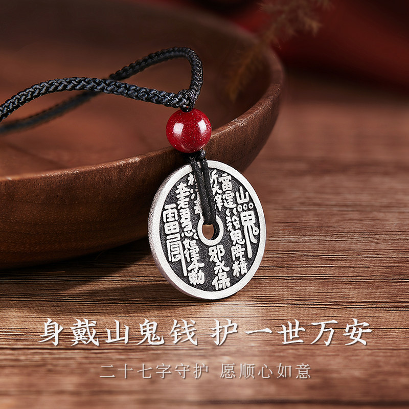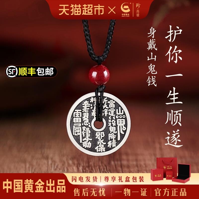 📚 【中国黄金】珍尚银山鬼花钱足银项链复古铜钱吊坠生日礼物送男友