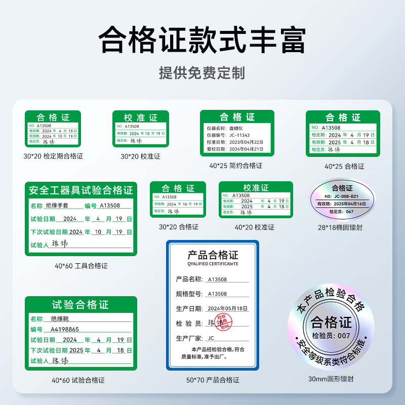📚 精臣M2热转印产品合格证标签打印机校准证计量检验质检定镭射不干胶贴纸安全工器具试验日期亚银圆形卡片定制