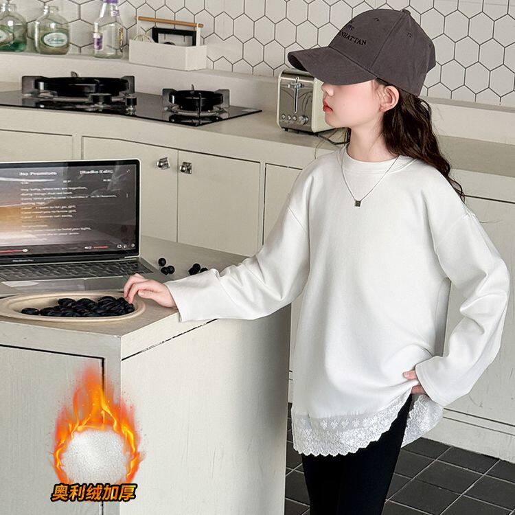 📚 女童打底衫蕾丝T恤加绒加厚冬装中长款洋气时尚中大童百搭白色潮