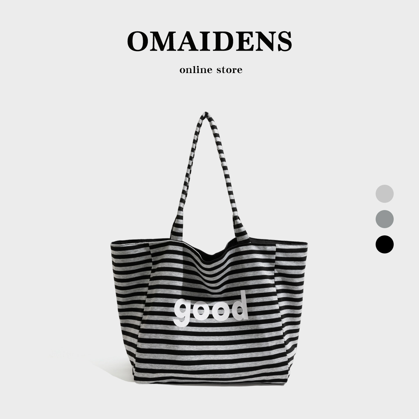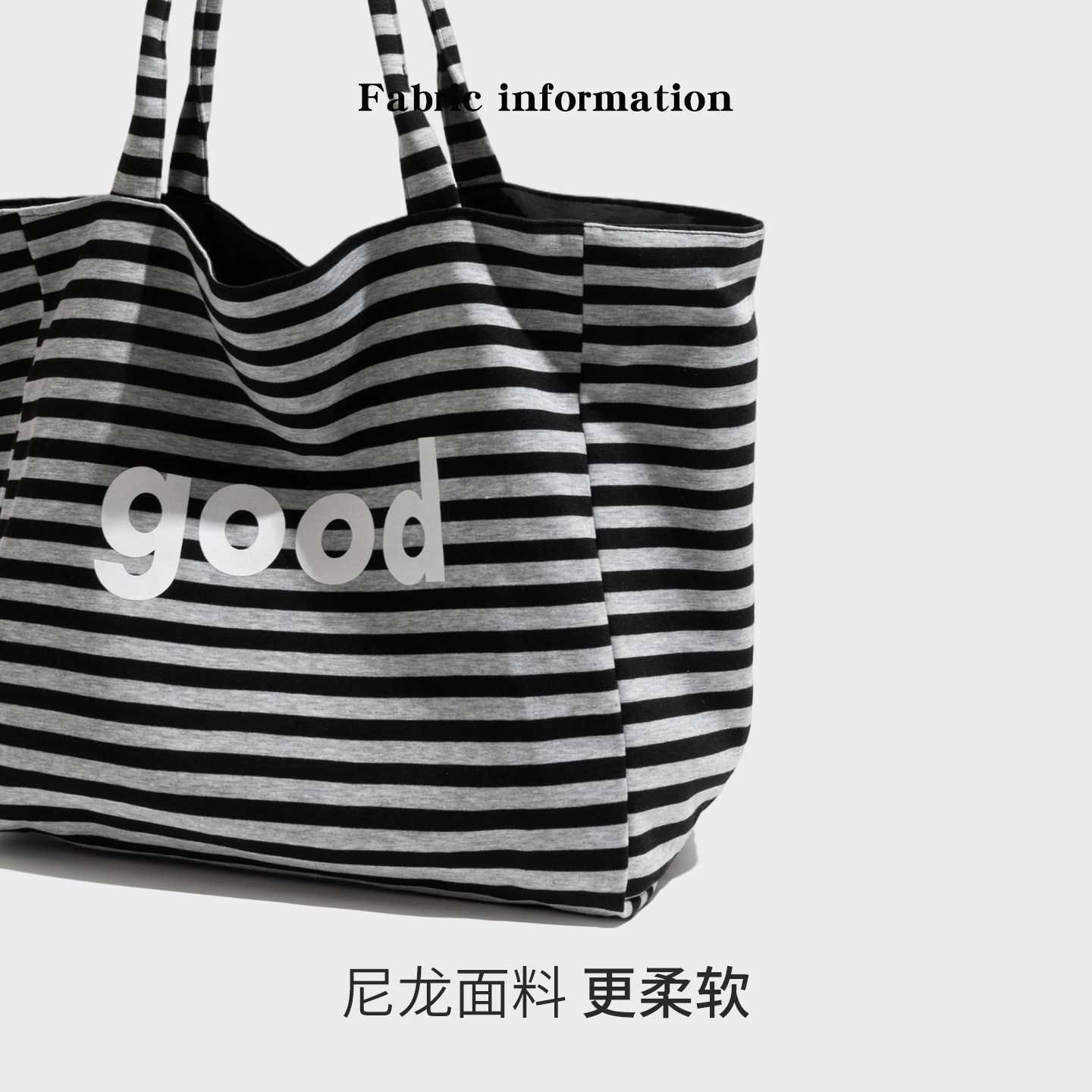 📚 橙子少女黑白条纹帆布包女大容量单肩包通勤百搭慵懒风托特包手提