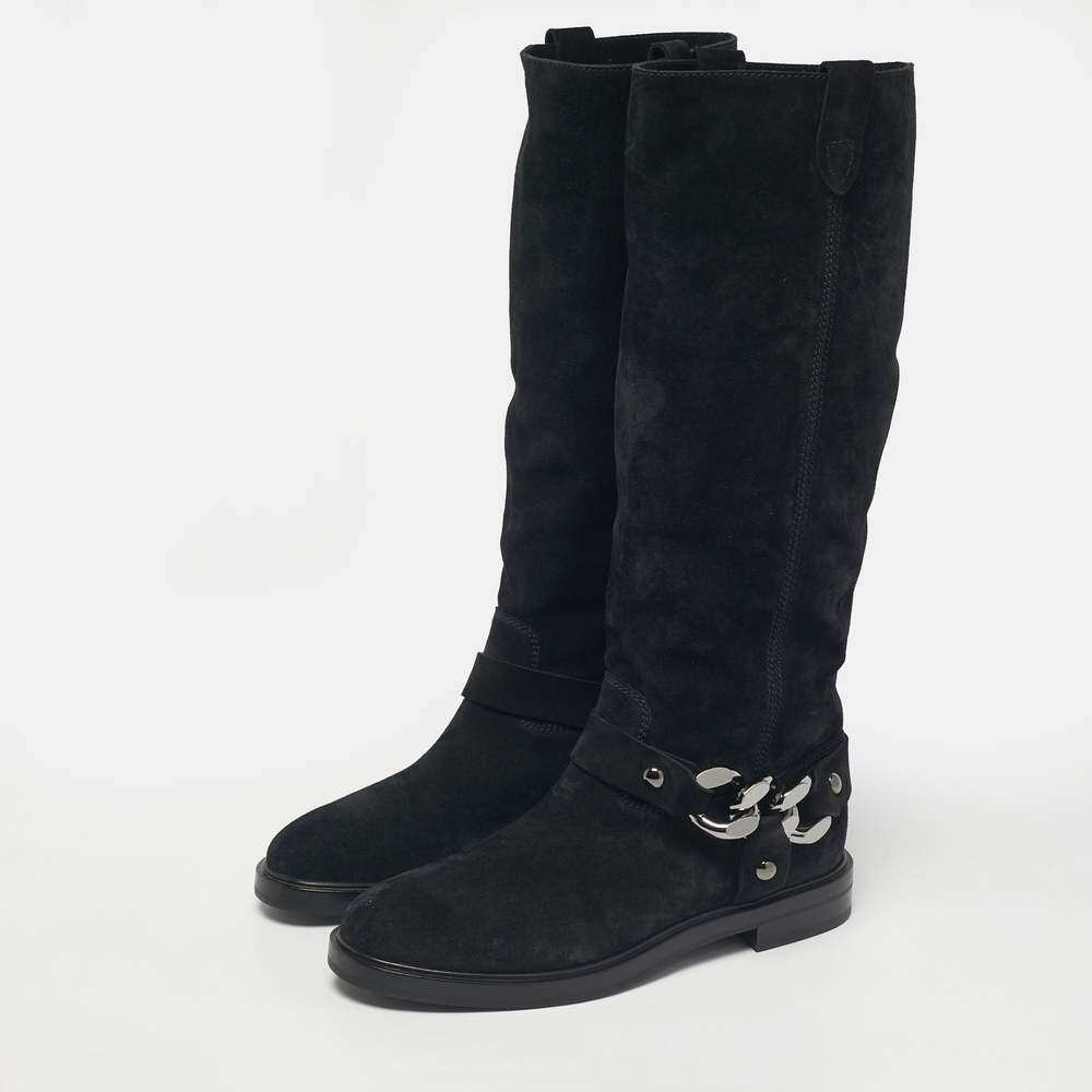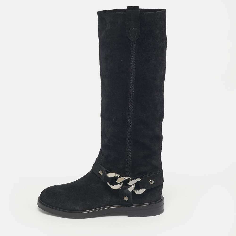 📚 自营Casadei Black Suede Chain Detail Knee Length Boots - bla