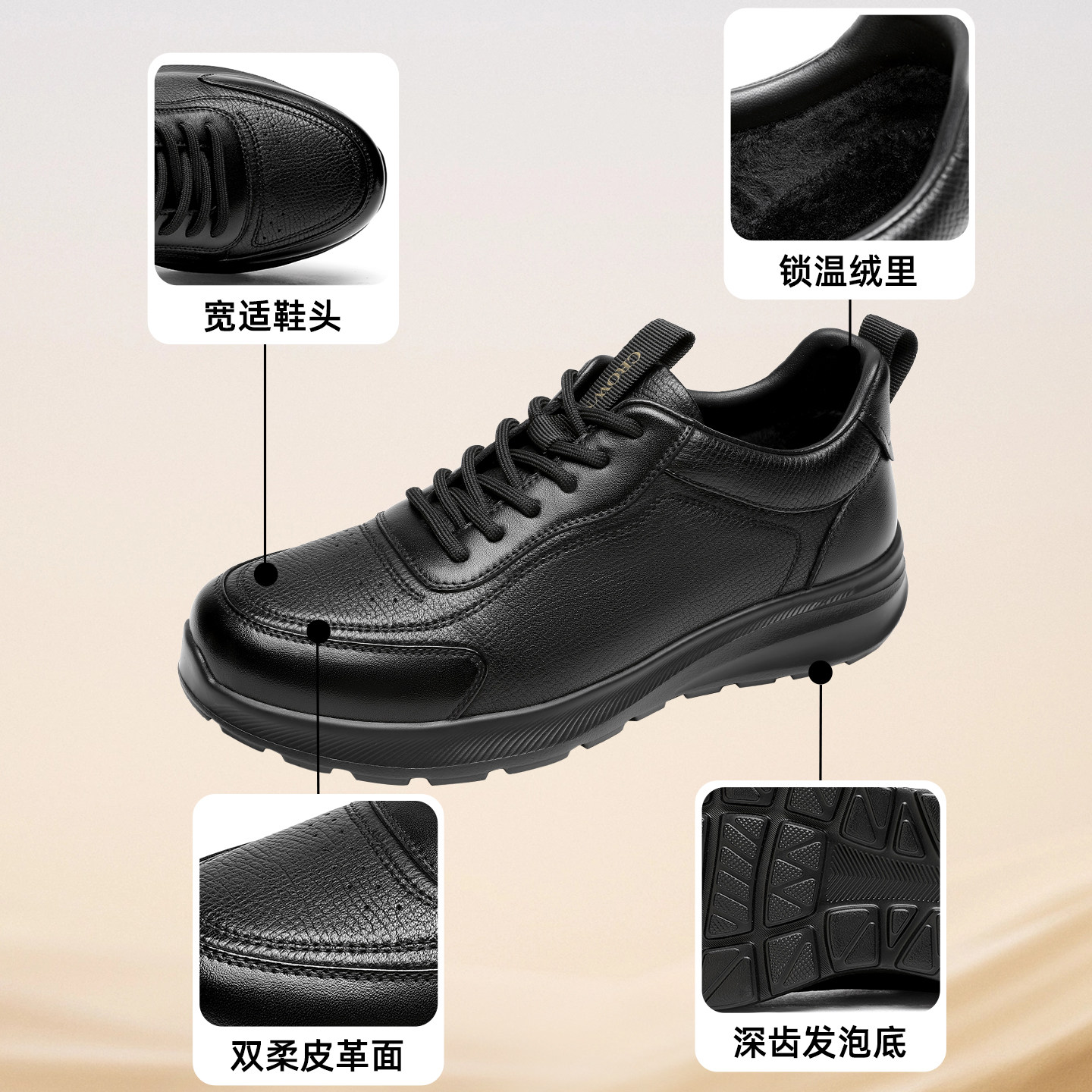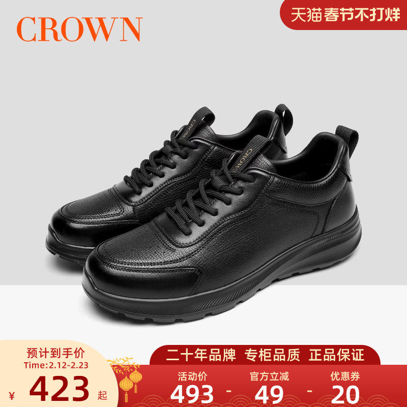 📚 CROWN/皇冠休闲男鞋真皮冬季板鞋加绒保暖舒适厚底增高户外通勤鞋