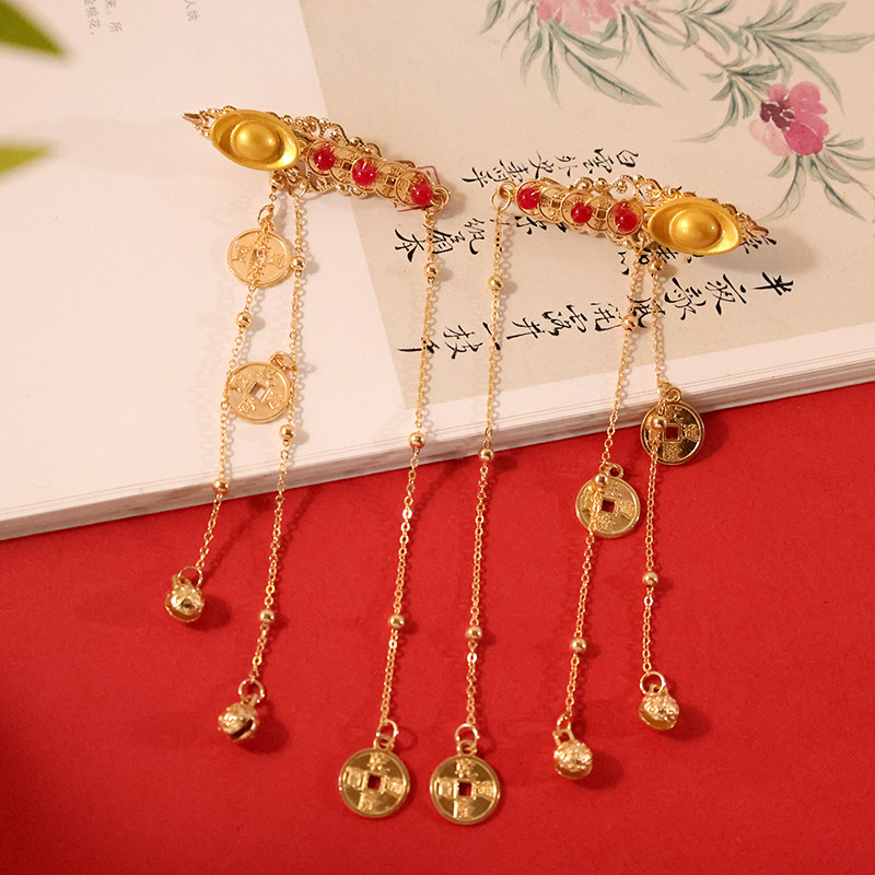 📚 国风古风红色新年头饰毛球小财神铜线元宝流苏发夹发冠发钗步摇