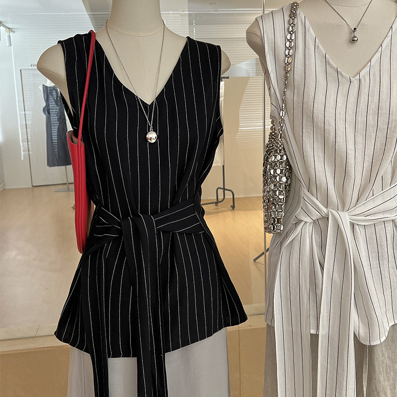 📚 黑白竖条纹背心女夏薄款绑带收腰 设计感无袖衬衫简约法式v领上衣