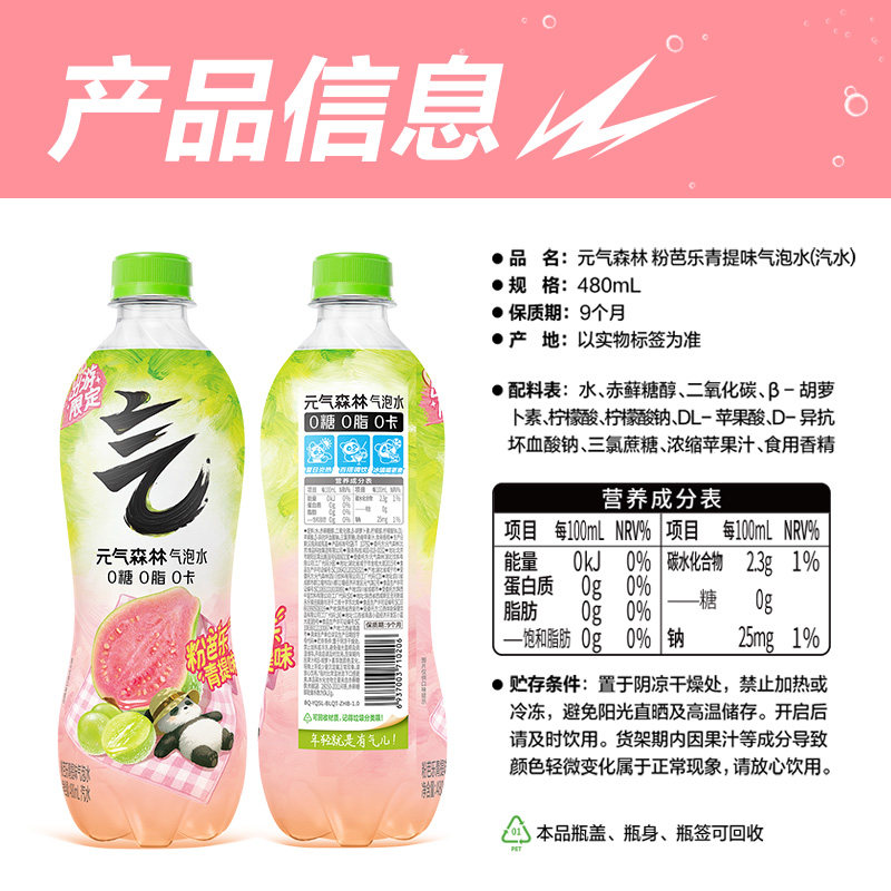 📚 【出游限定】元气森林粉芭乐青提味气泡水480ml*15瓶春季0糖0卡