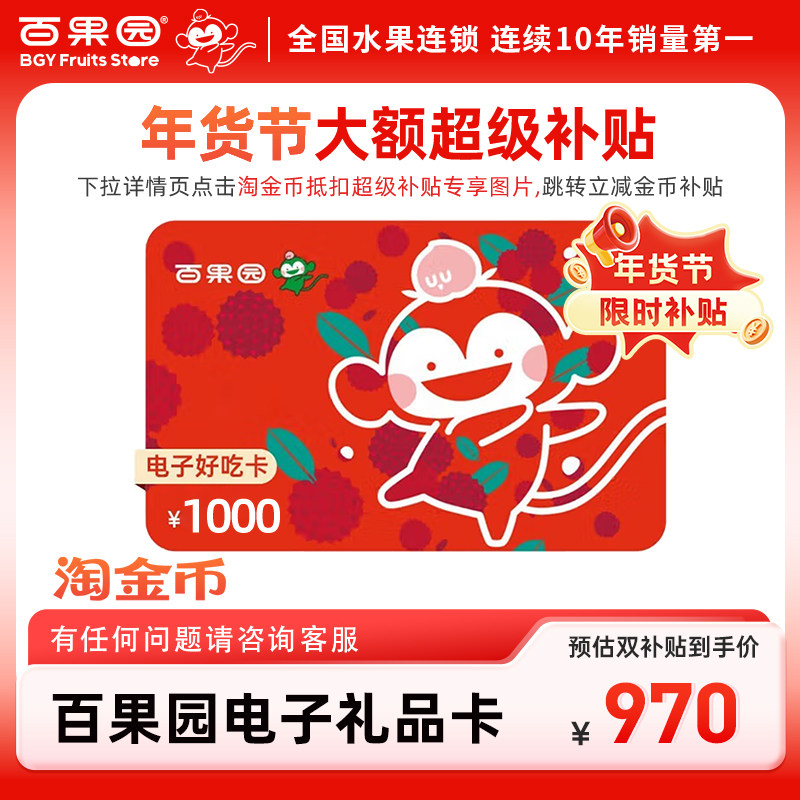 📚 【下拉详情页跳淘金币优惠】百果园好吃卡1000元线上线下均可使用