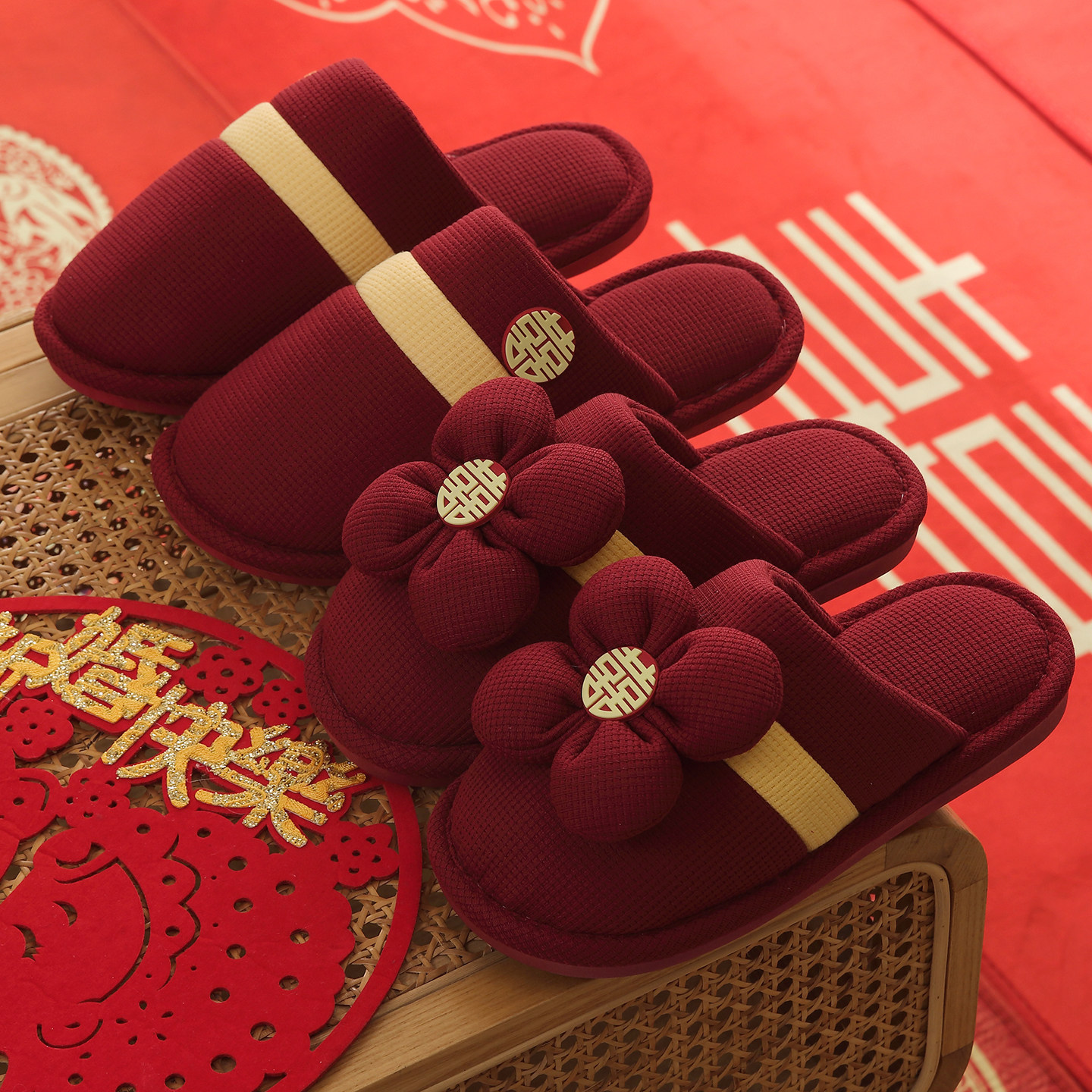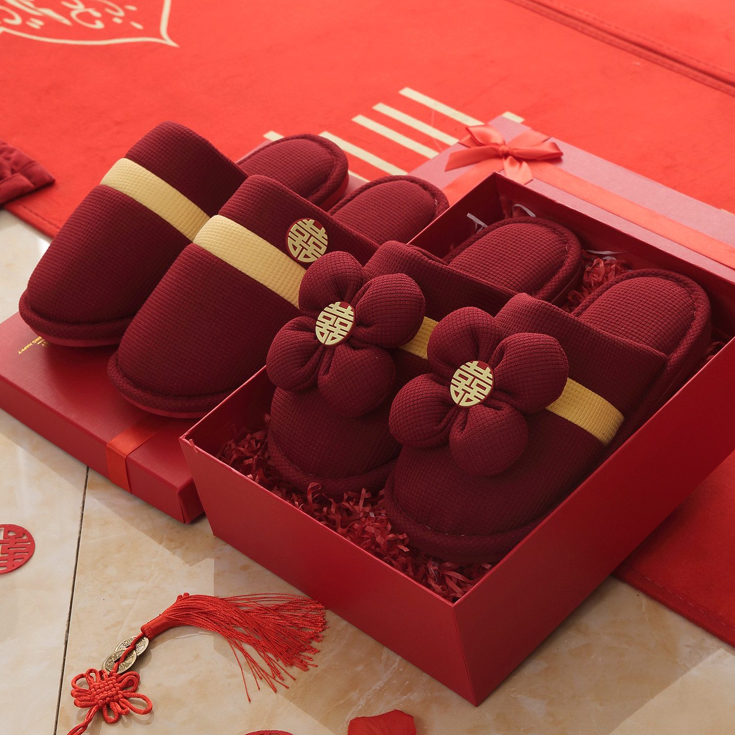 📚 冬季结婚棉拖鞋酒红色一对轻奢喜庆新婚情侣新娘陪嫁本命年高级感