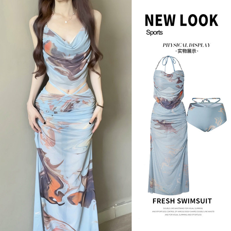 📚 高级感淑女款泳衣女款长裙性感比基尼海边度假三件套带胸垫带钢托