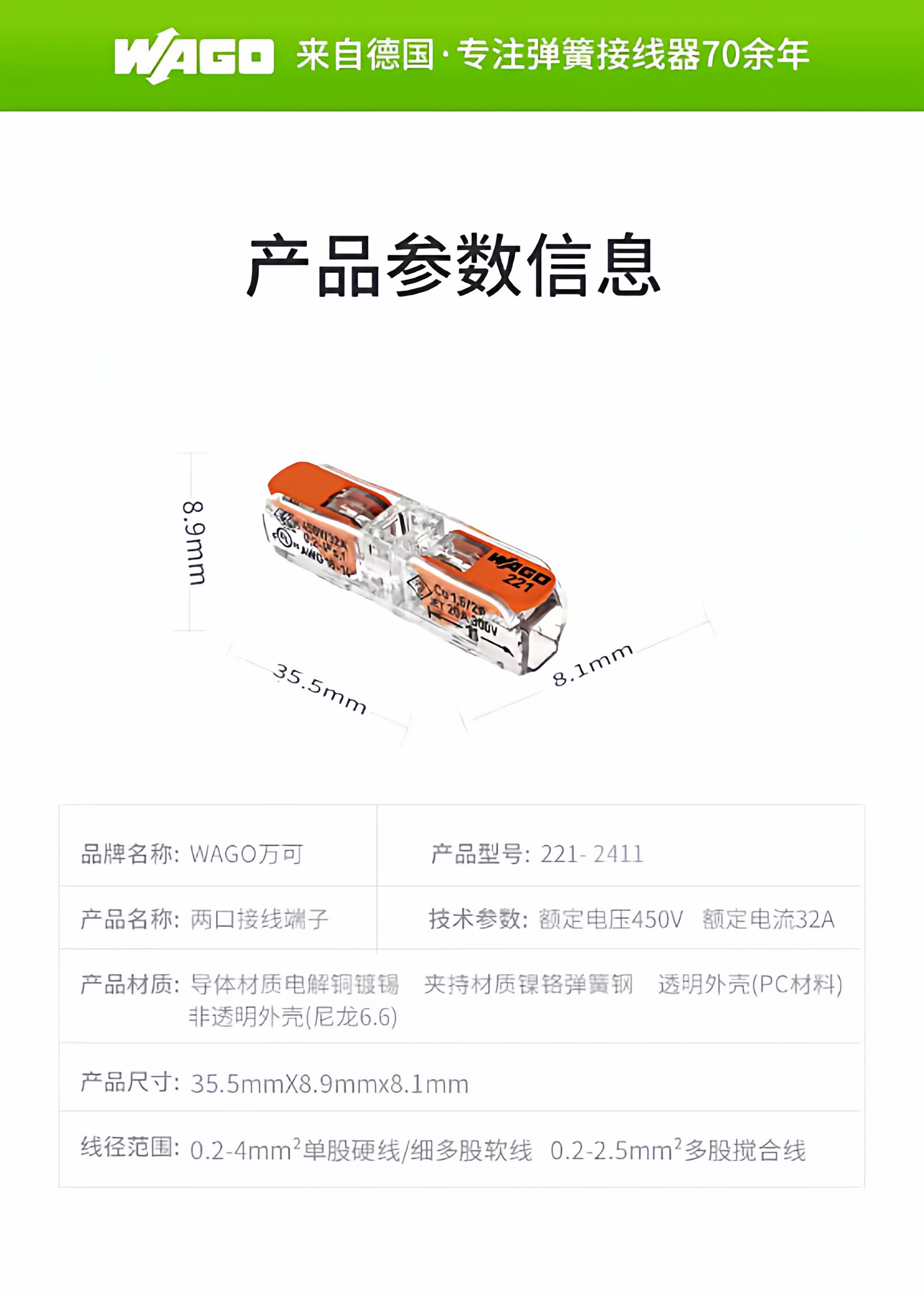 📚 wago万可接线端子221-2411灯具对接连接器电线快速接头10只装包邮