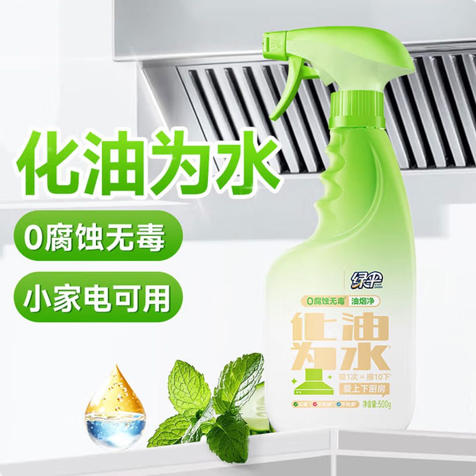 📚 绿伞0腐蚀油烟净500g瓶化油为水厨房餐厅小家电油污净青瓜薄荷香