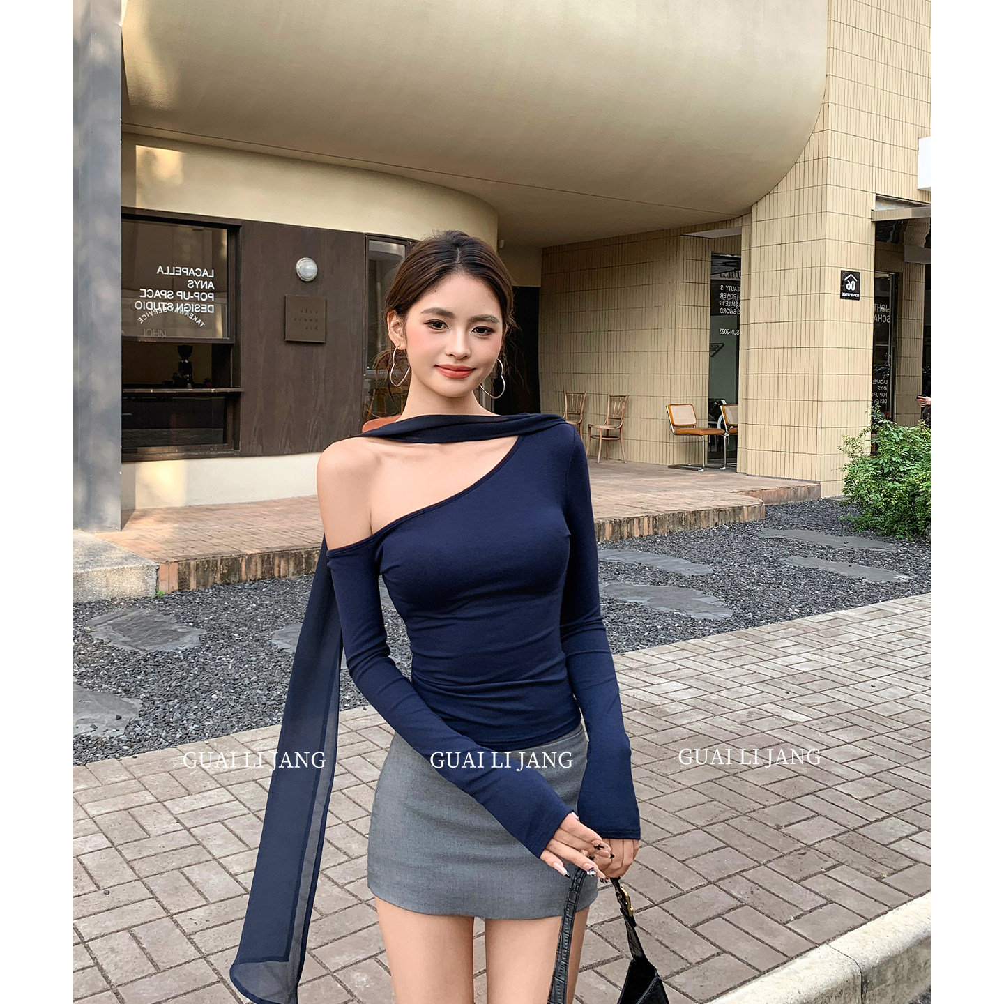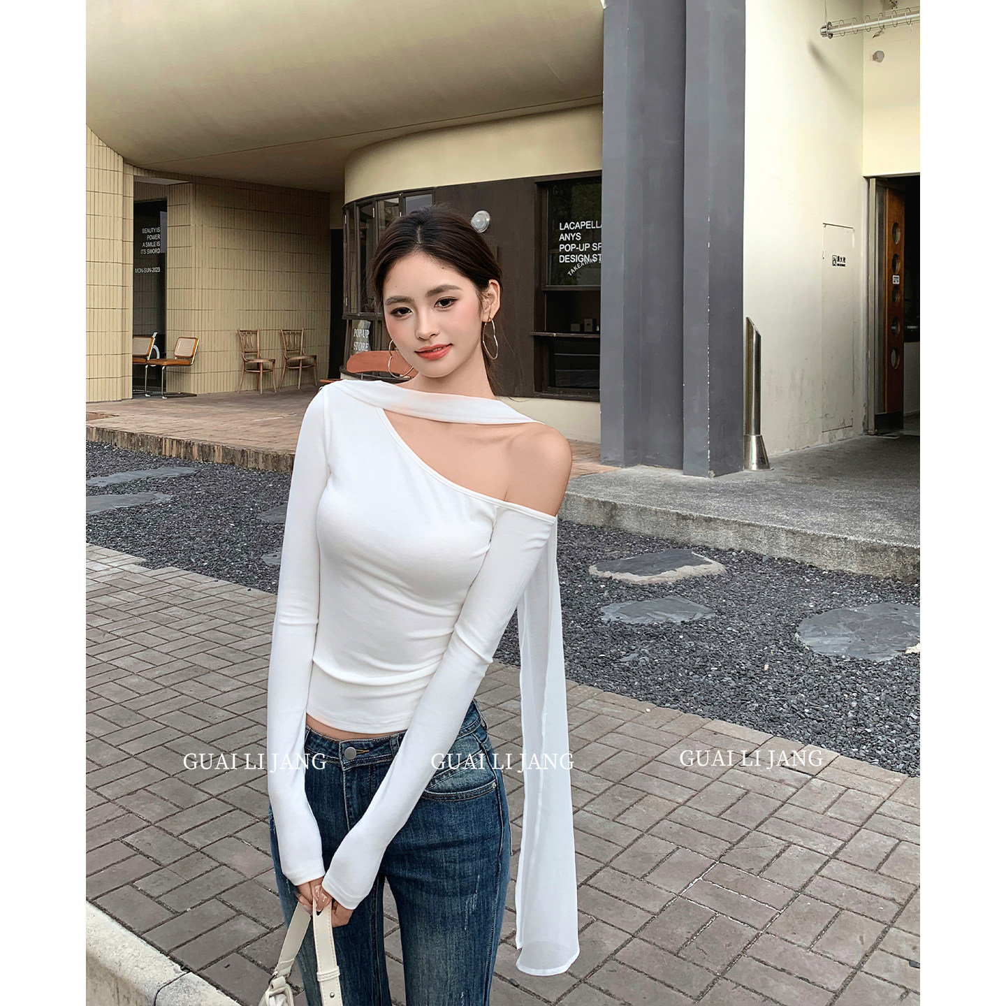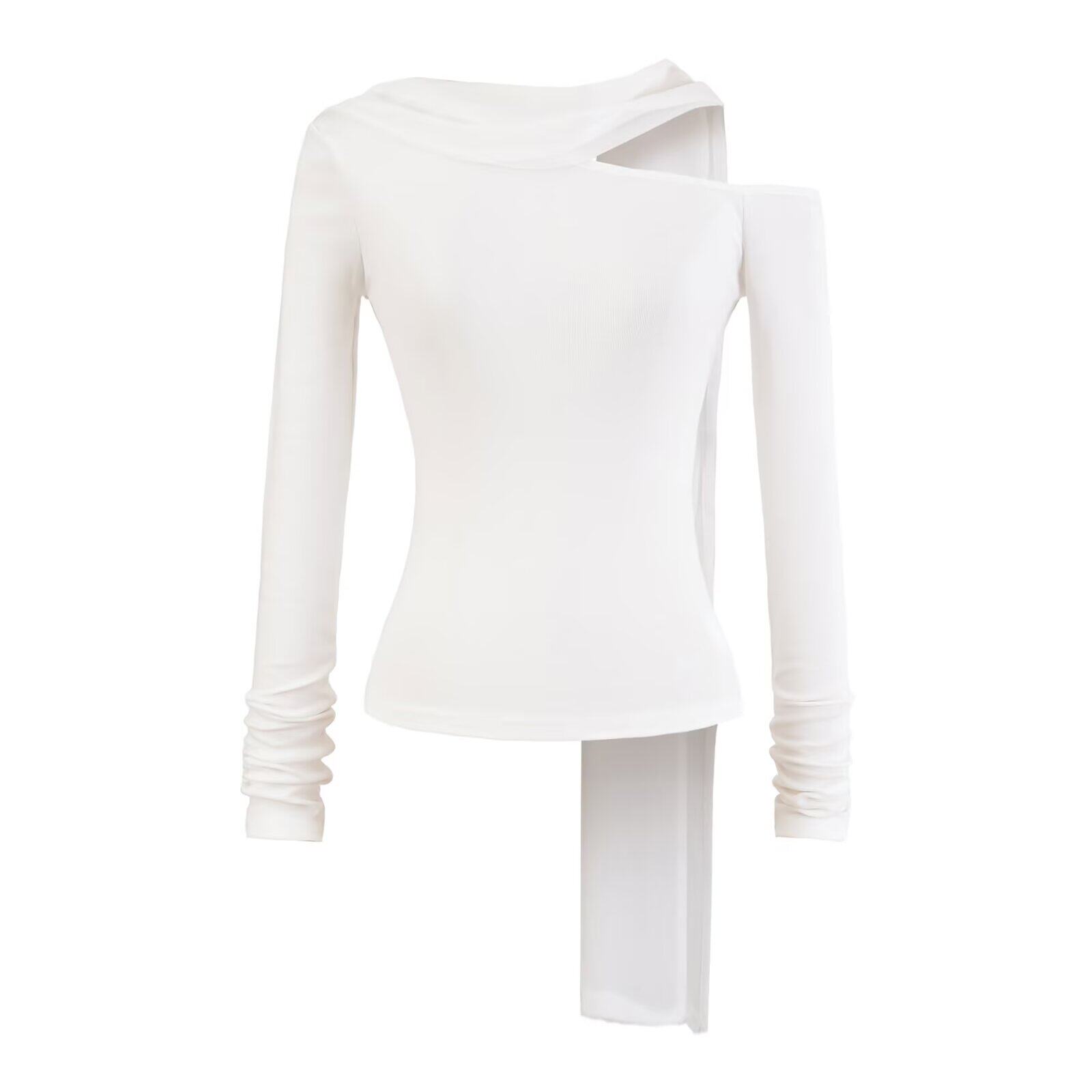📚 怪力酱 斜肩飘带长袖t恤女春季修身收腰性感辣妹露肩短款内搭上衣