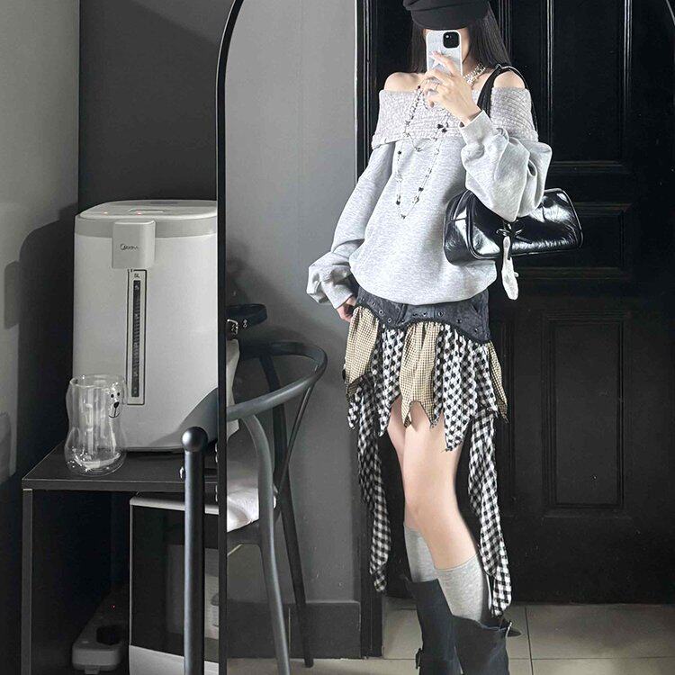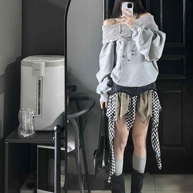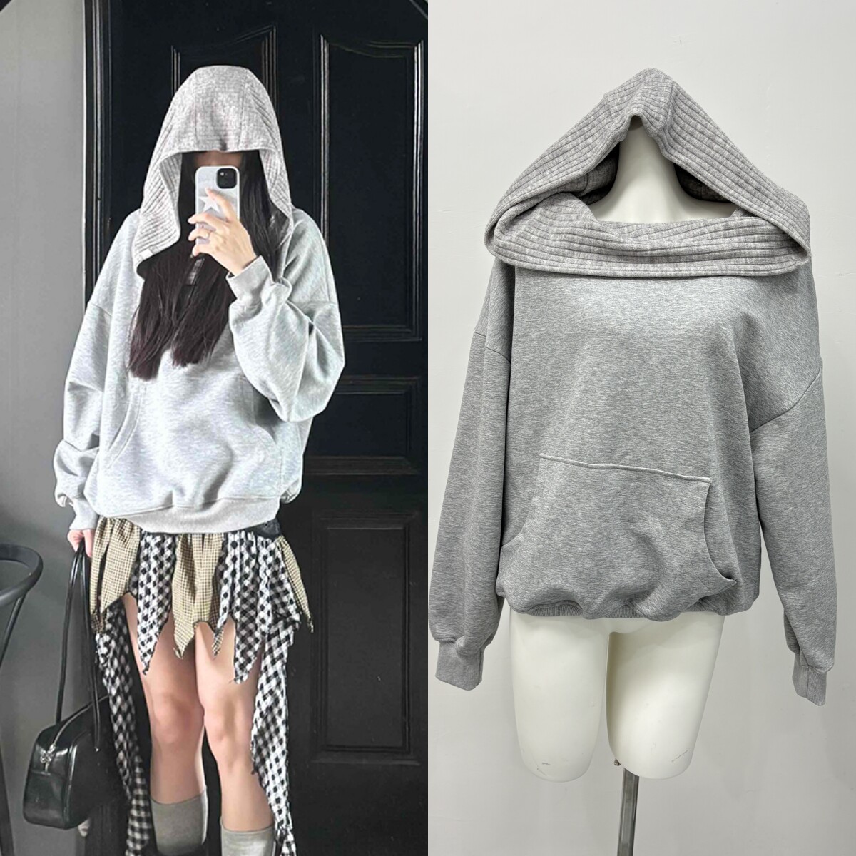 📚 SALTHe盐茶丨博尔赫斯斜肩一字领宽松套头连帽卫衣露肩上衣女