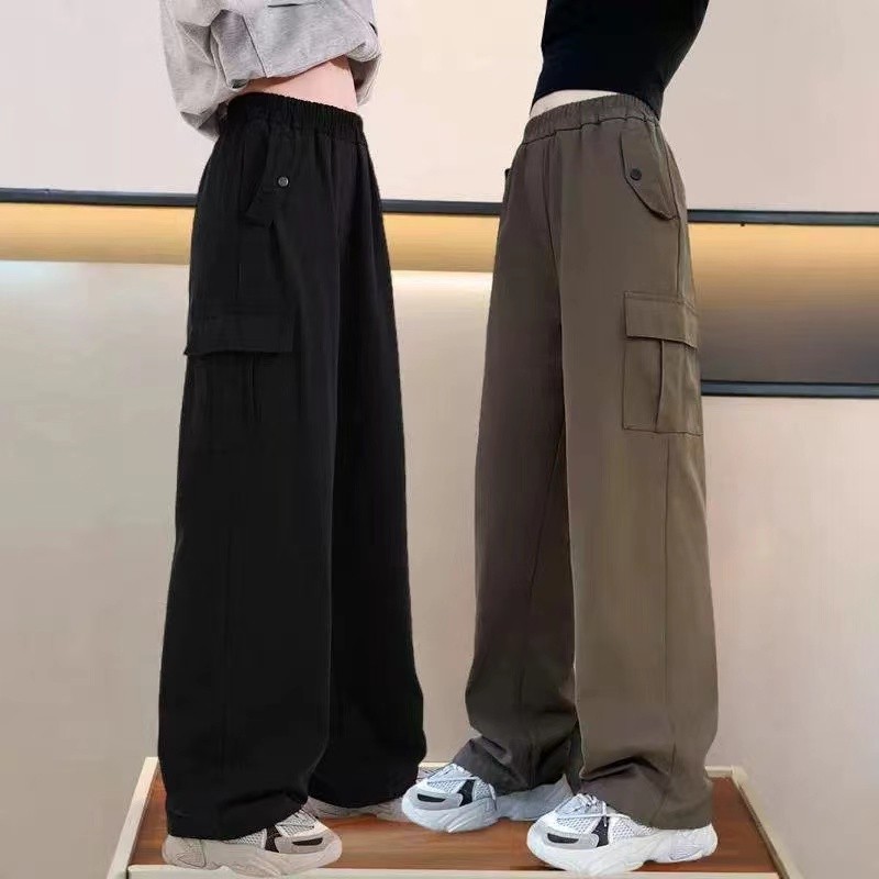 📚 女童裤子工装裤春秋中大童初中生秋冬儿童加绒运动阔腿裤黑色紫色