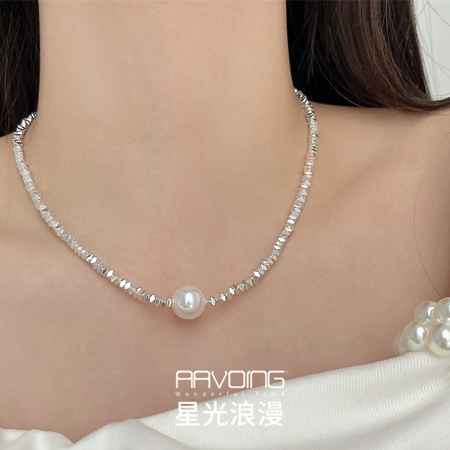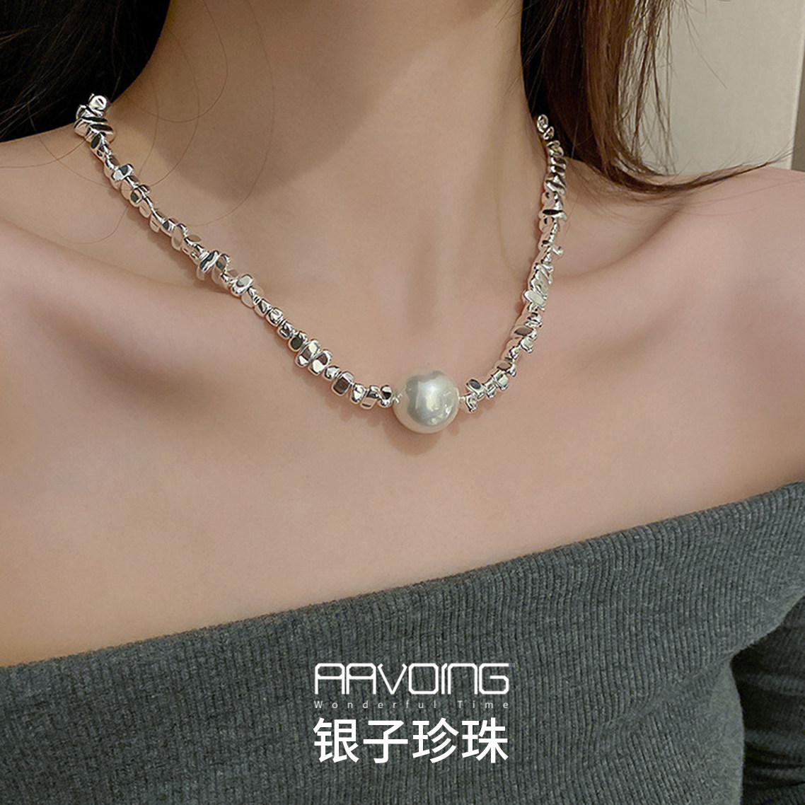 📚 不规则碎银复古气质锁骨链百搭潮流白k项链夸张男女情侣珍珠吊坠