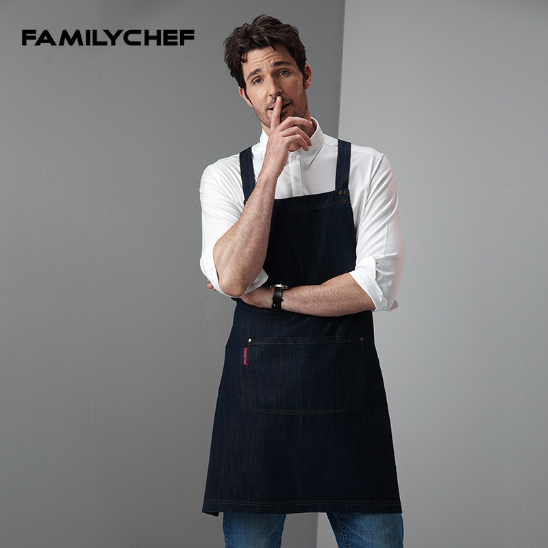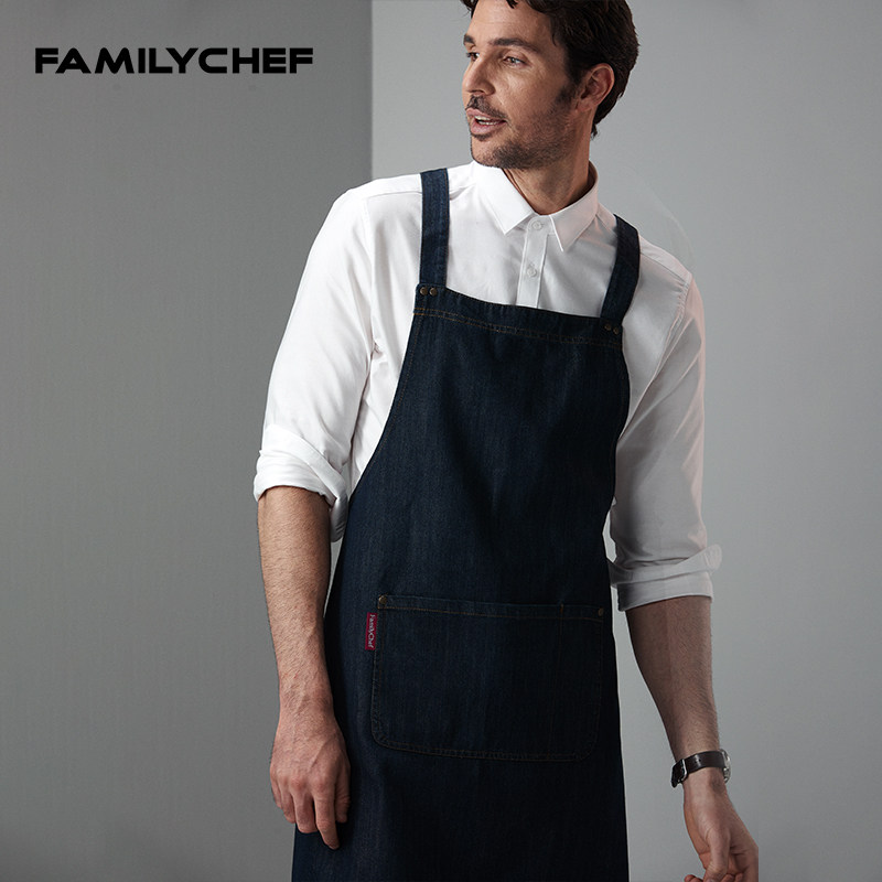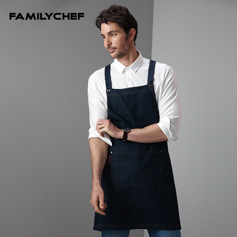 📚 交叉韩版牛仔围裙男士厨房挂脖围腰中长款全棉咖啡馆面包房工作服