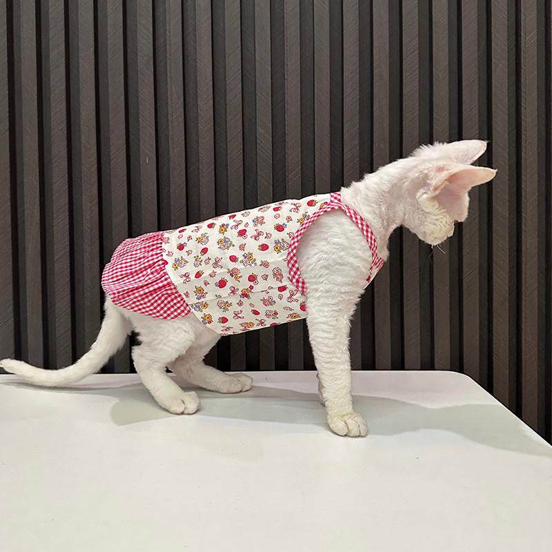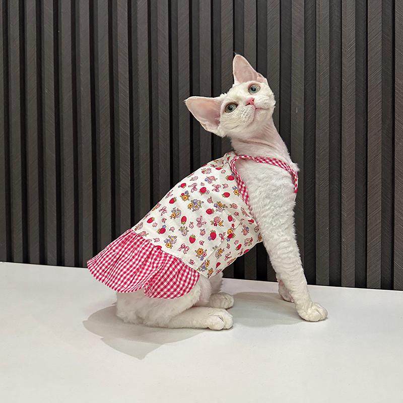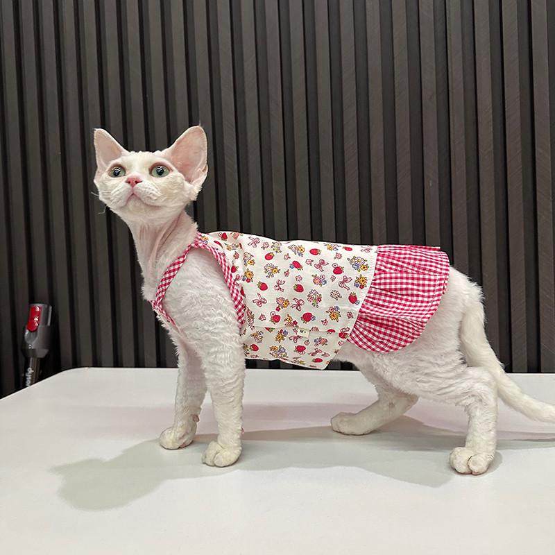 📚 可爱草莓格子吊带任发财无毛猫衣服德文衣服斯芬克斯猫可爱