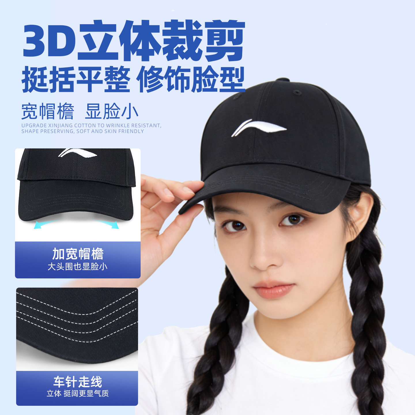📚 李宁棒球帽男女黑色鸭舌帽硬顶显脸小遮阳防晒休闲百搭户外运动帽
