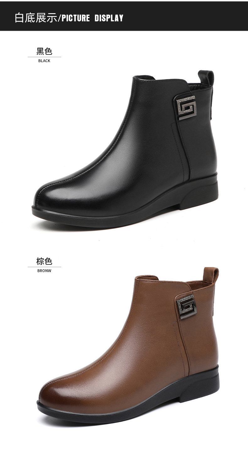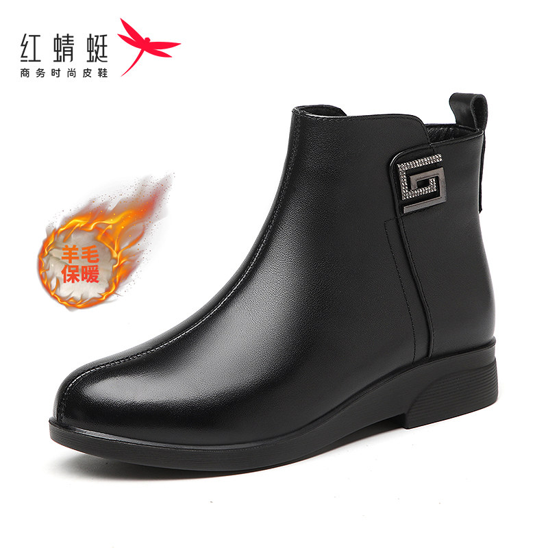 📚 红蜻蜓新款冬季中老年妈妈头层牛皮防滑软面软底加绒侧拉链女皮鞋