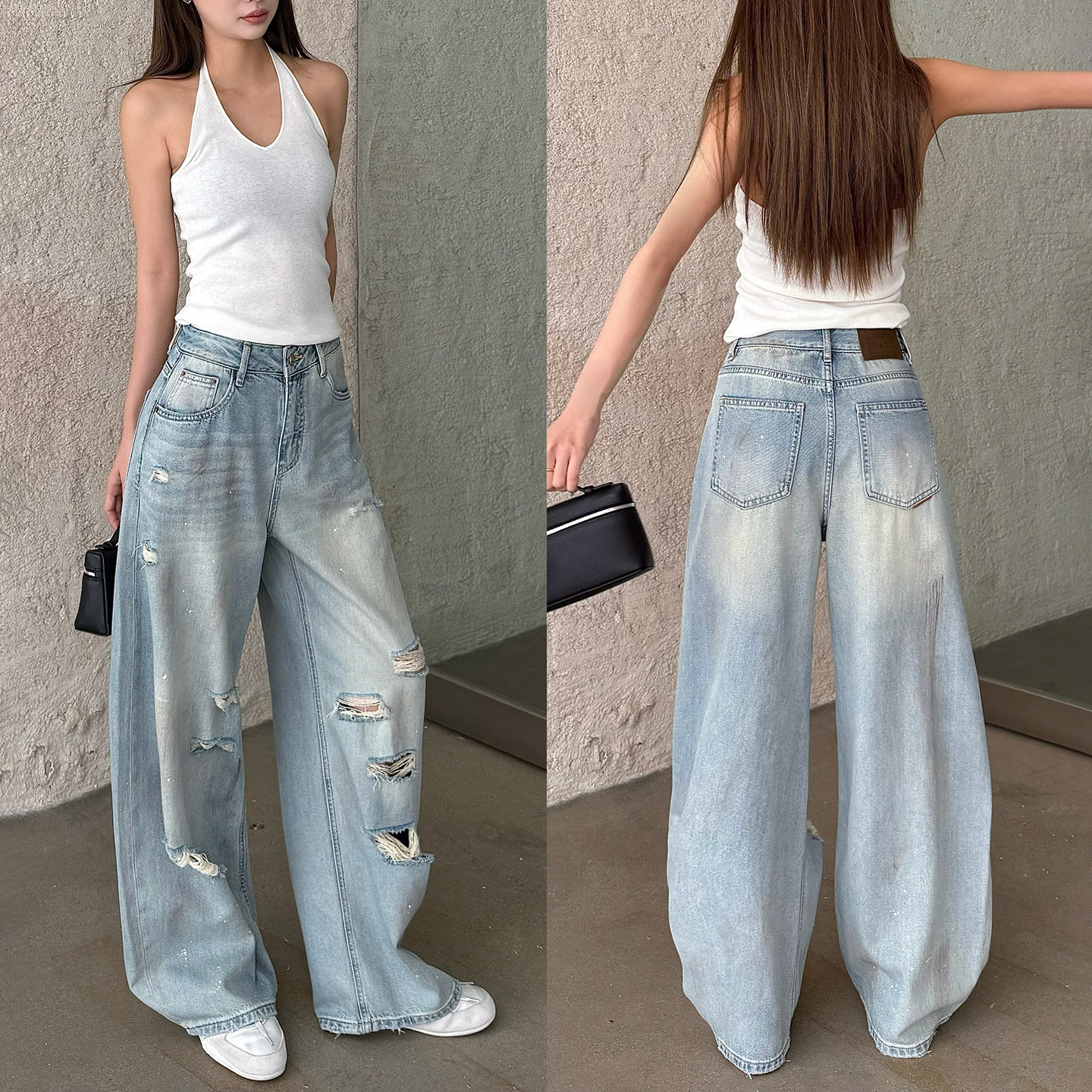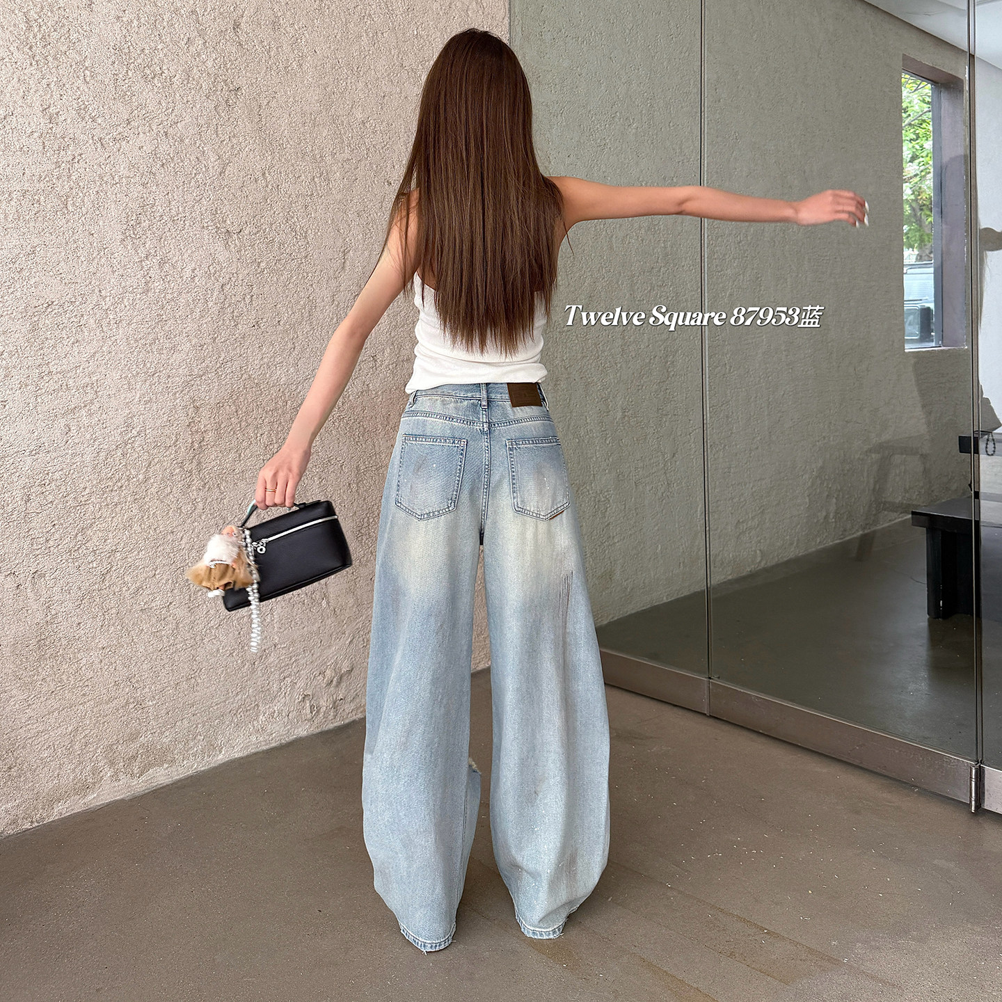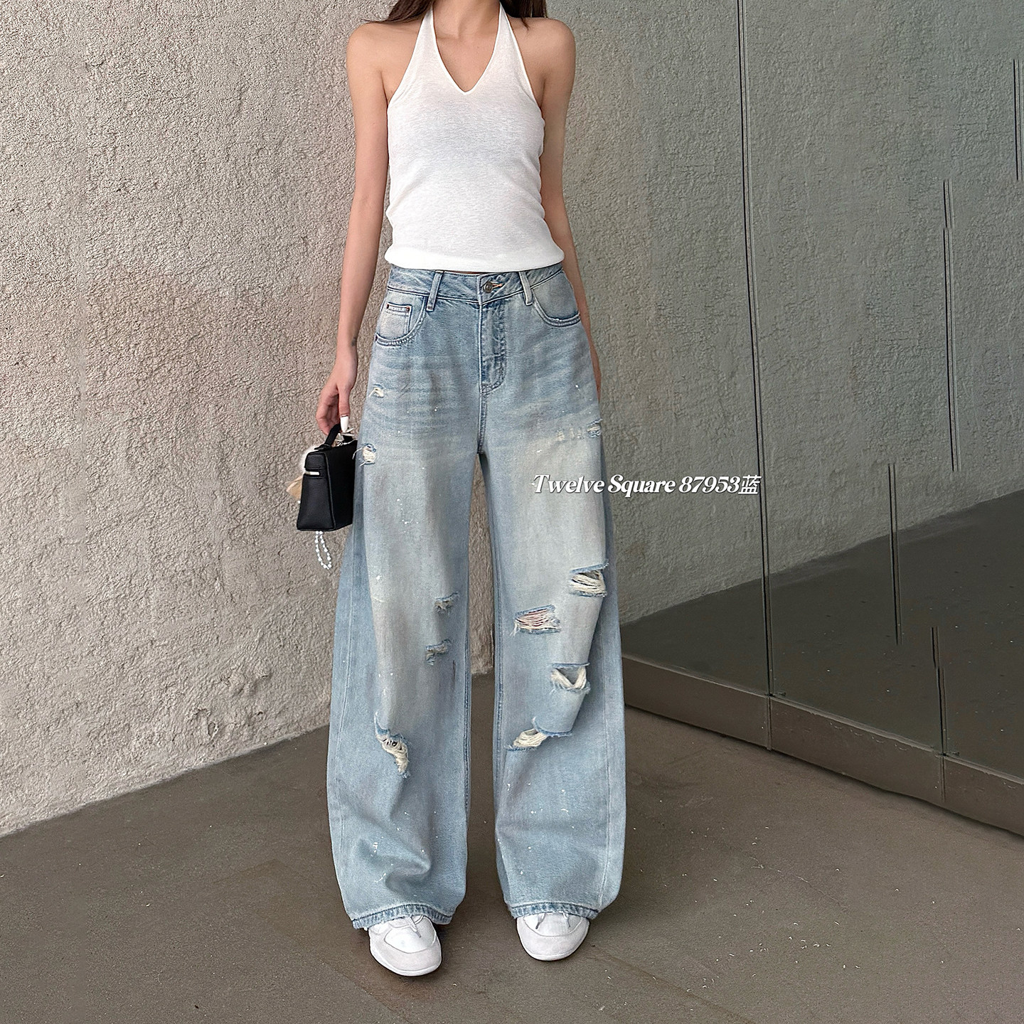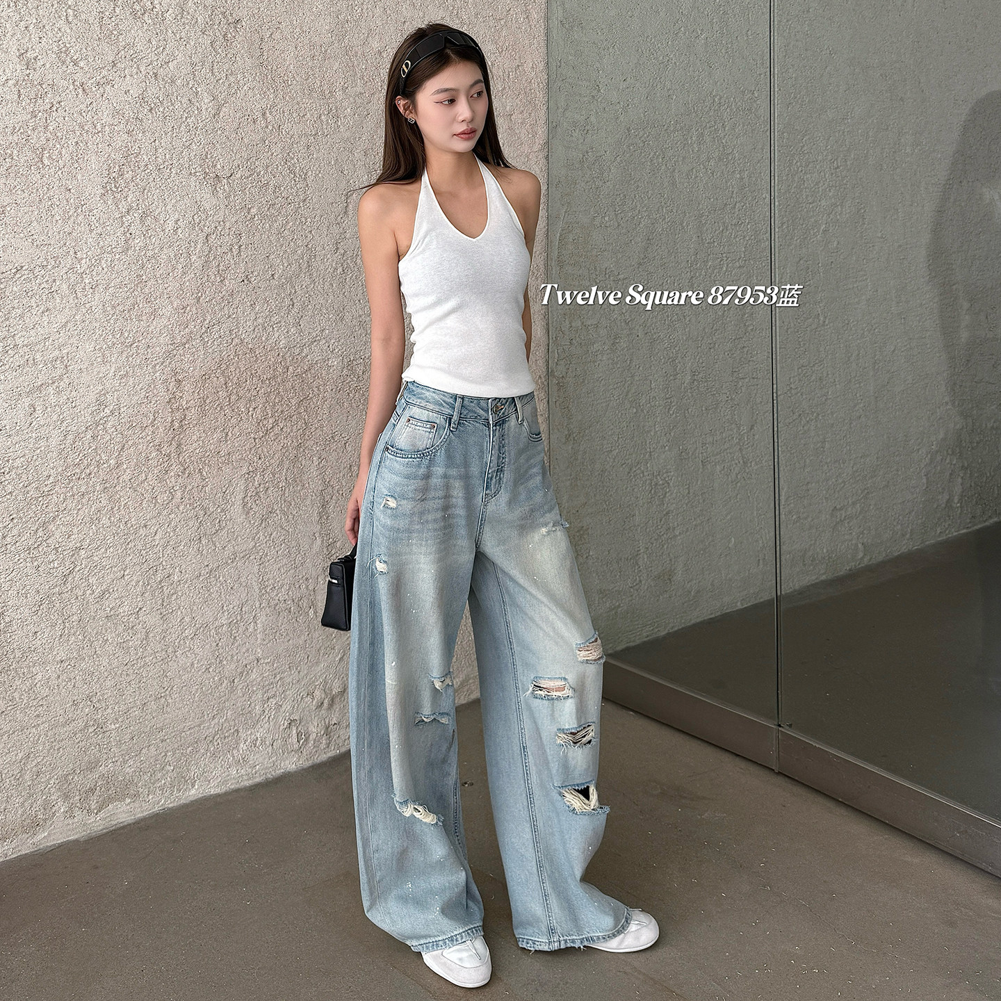 📚 12平方欧货痞帅脏脏色百搭水洗破洞弯刀牛仔裤女薄款夏季炸街裤子