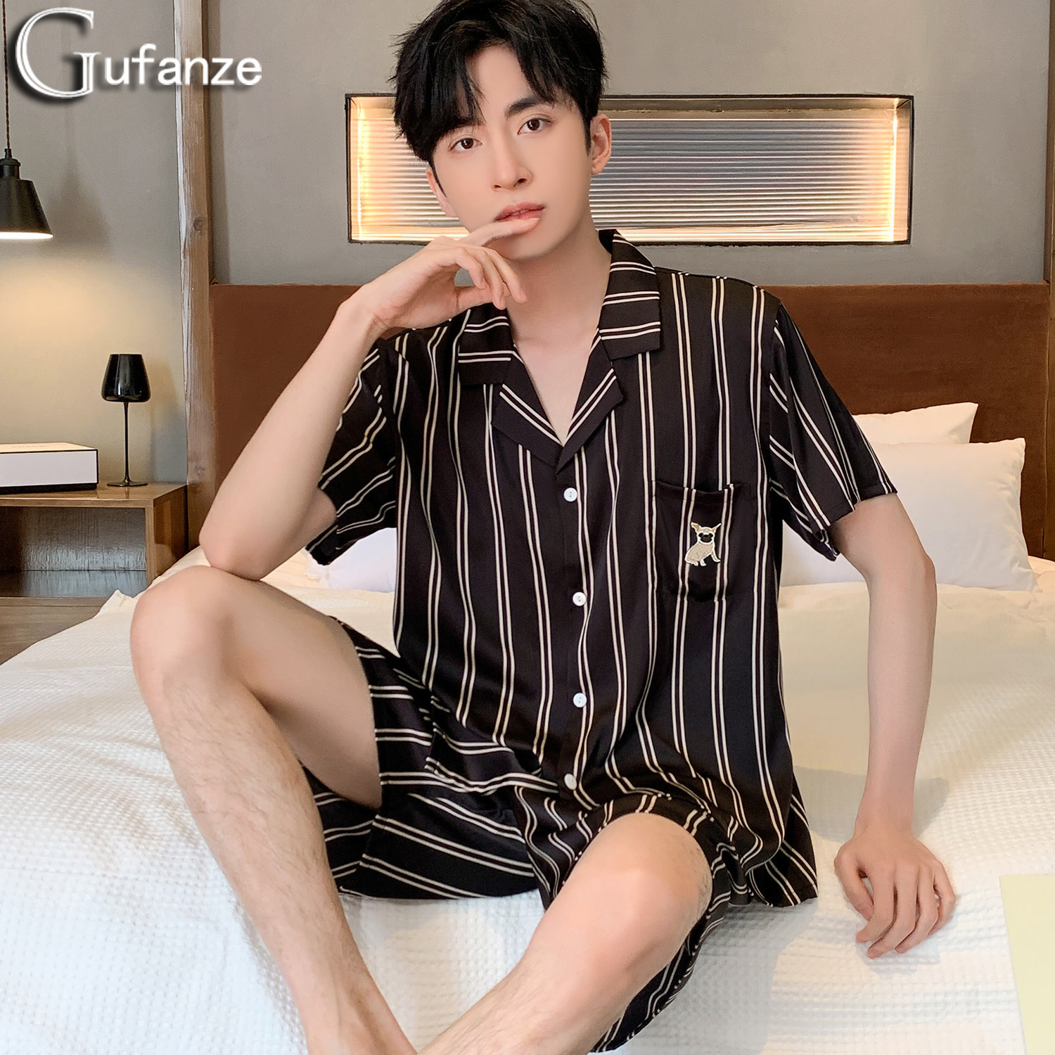 📚 男士睡衣夏款男款冰丝夏季丝绸缎薄款短袖短裤男生纯色家居服夏天