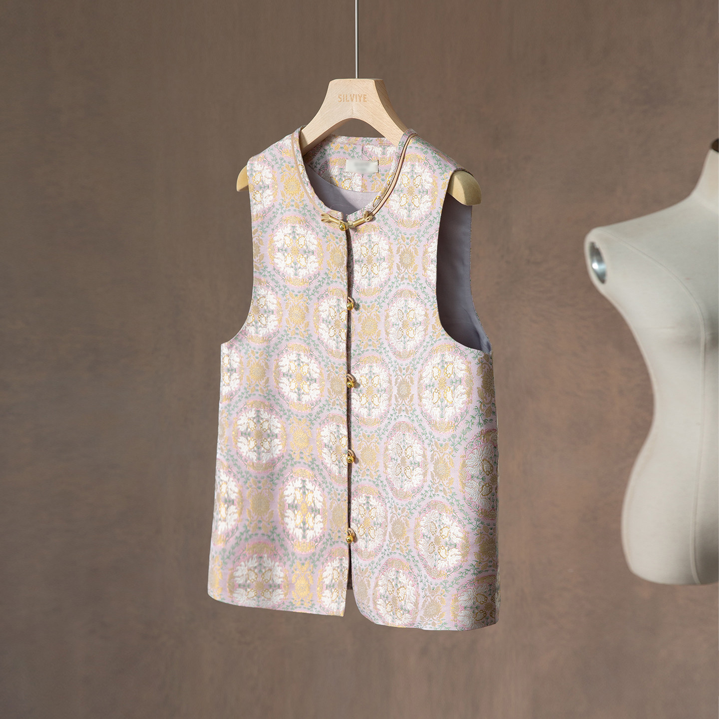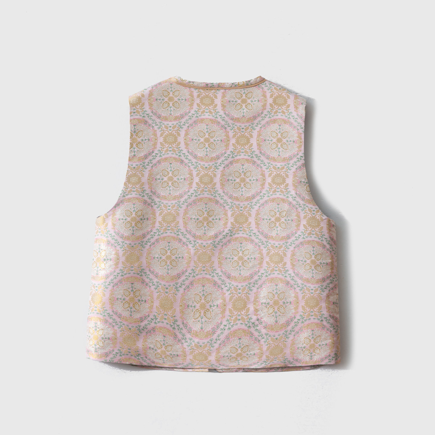 📚 一丝牵 金鱼戏莲粉 真丝宋锦新中式马甲100%桑蚕丝国风圆领上衣春
