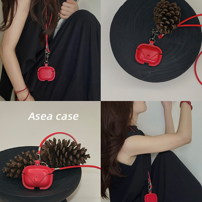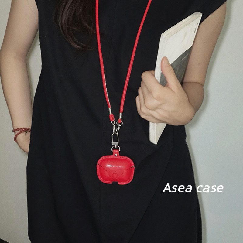📚 Asea小众ins复古红色皮质适用airpods pro3挂绳耳机套苹果2/三/4代无线蓝牙挂脖保护壳新款斜挎耳机包女男