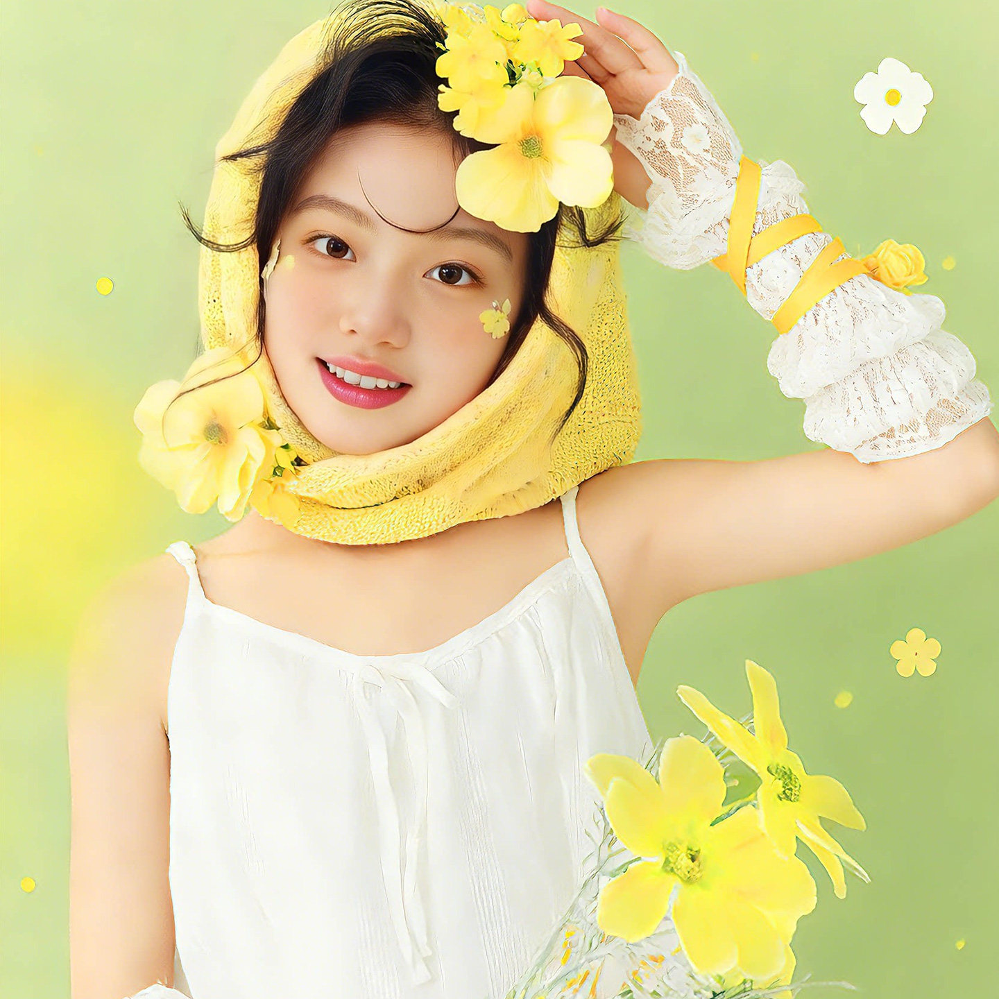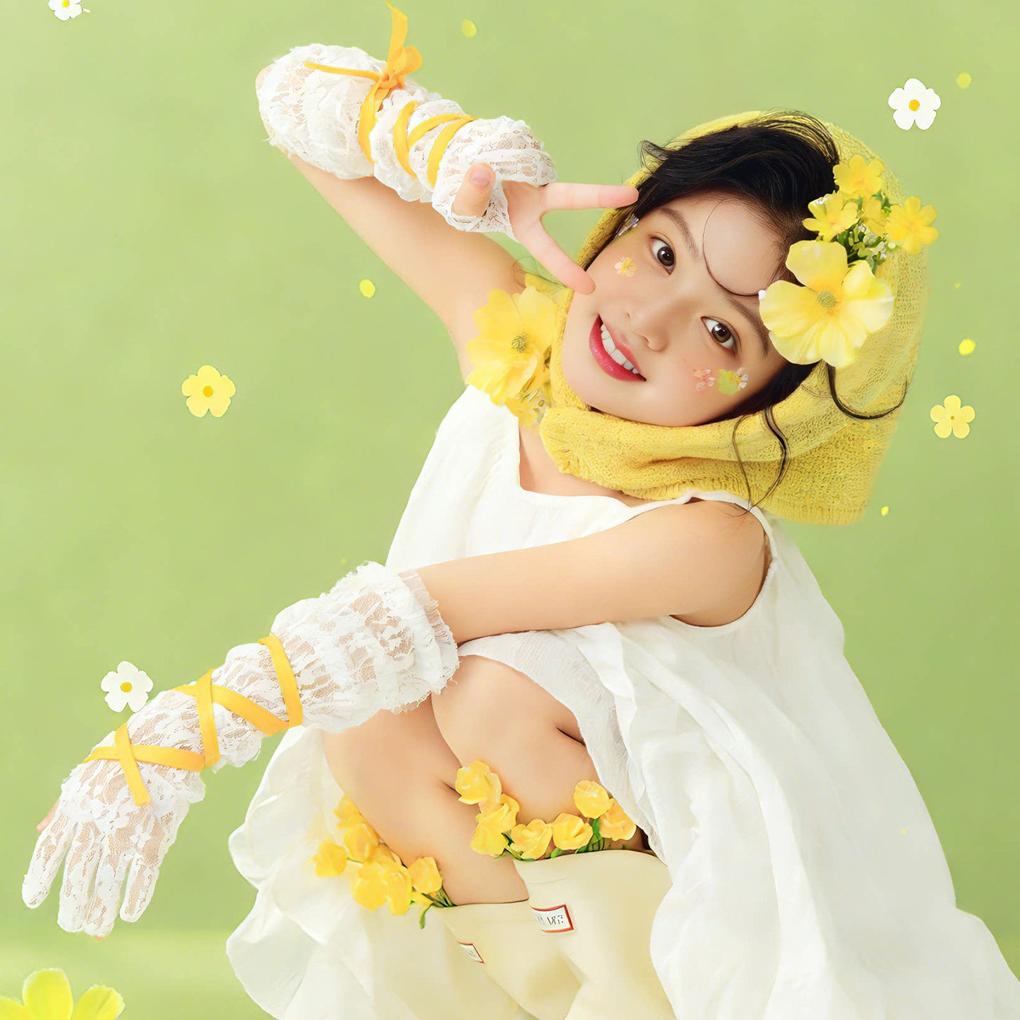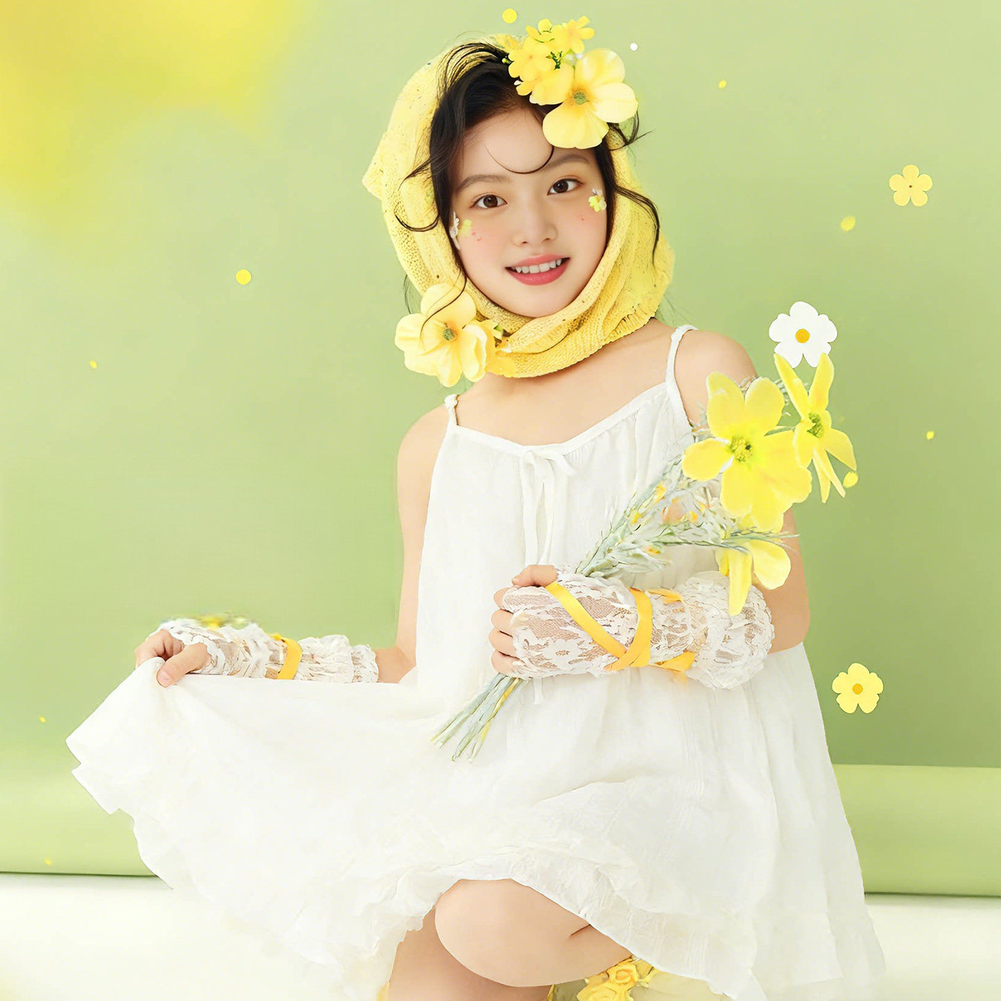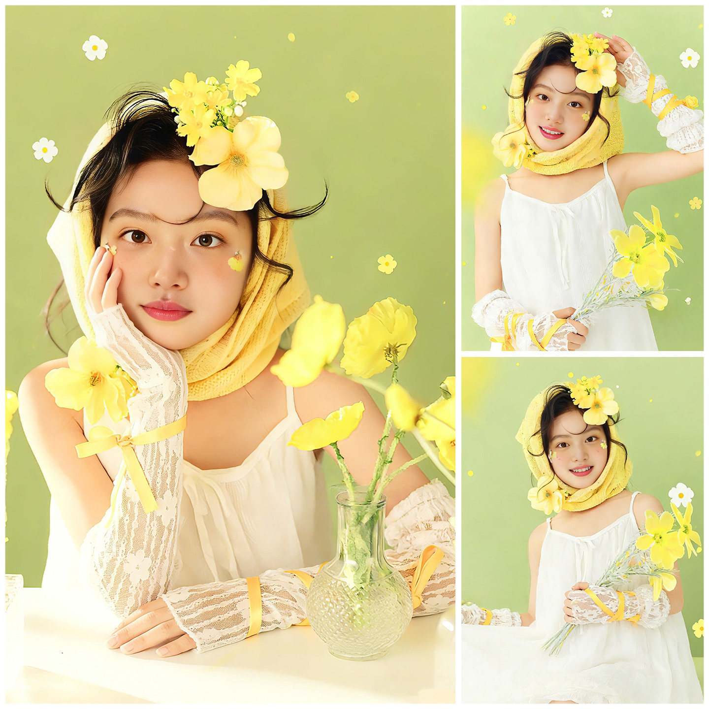 📚 儿童摄影服装道具黄色花朵头巾主题女童白裙子春季小清新影楼写真