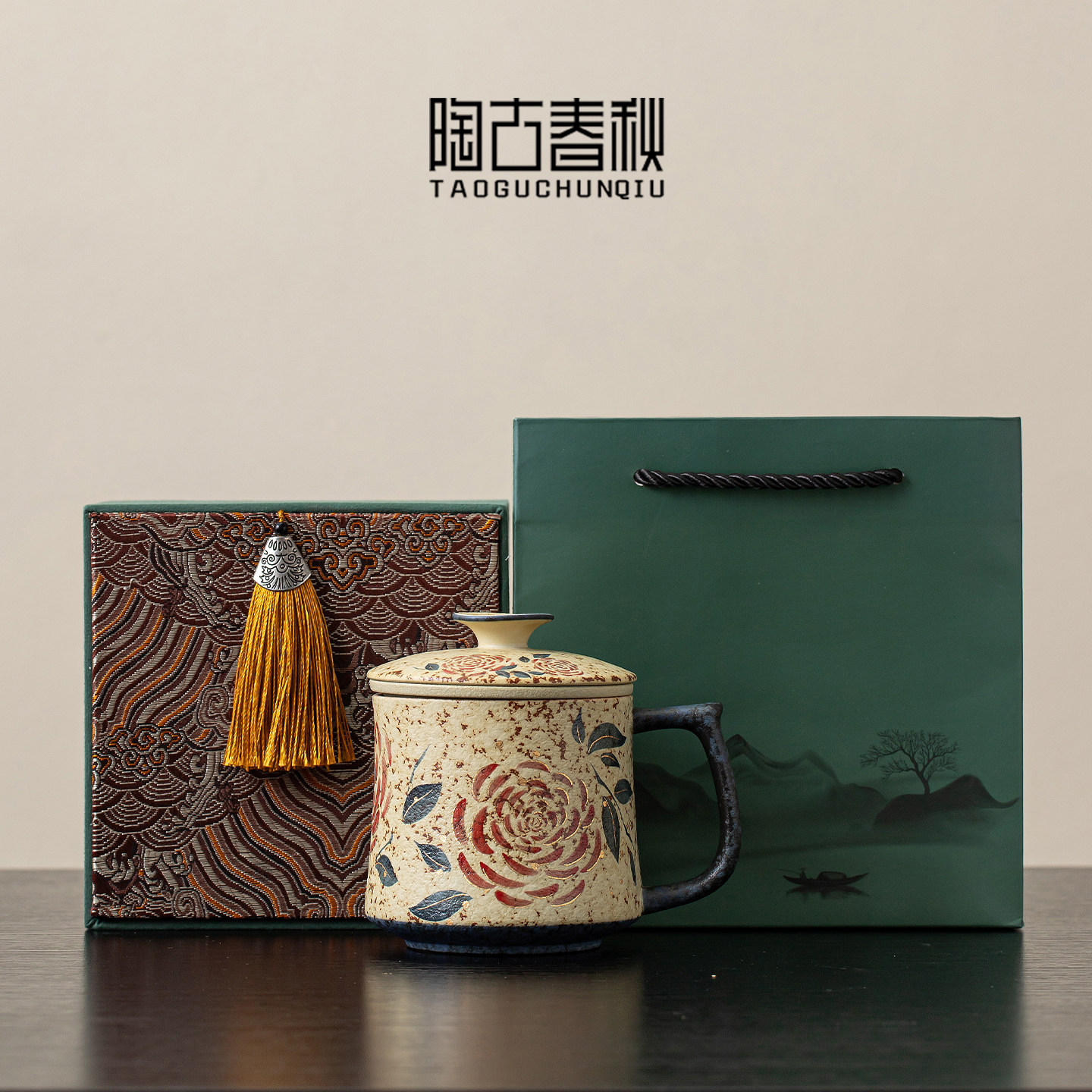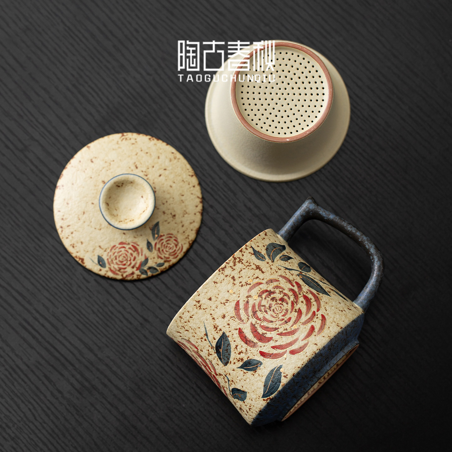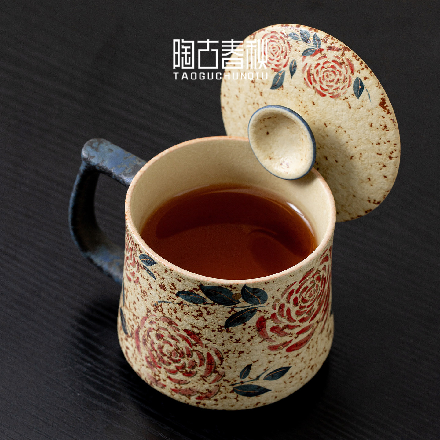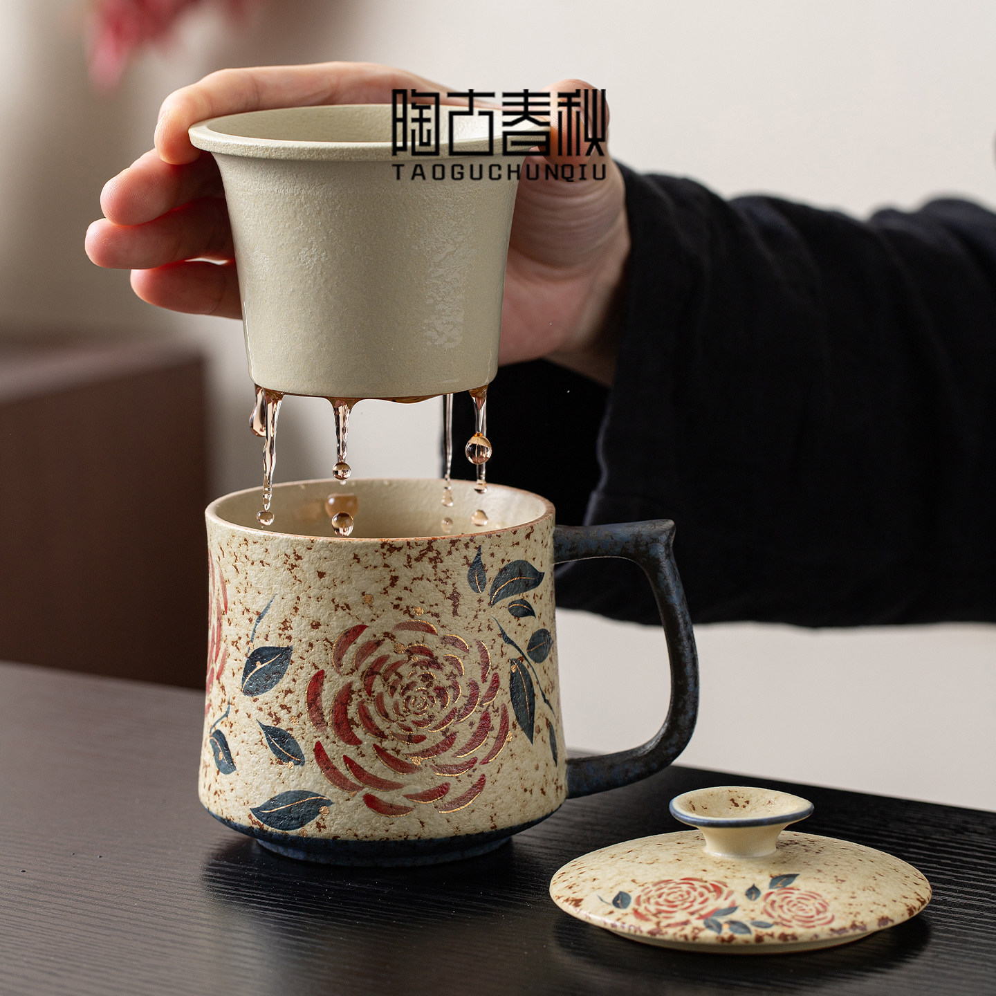 📚 玫瑰花青花火石红办公杯茶水分离泡茶杯复古陶瓷水杯带盖个人专用