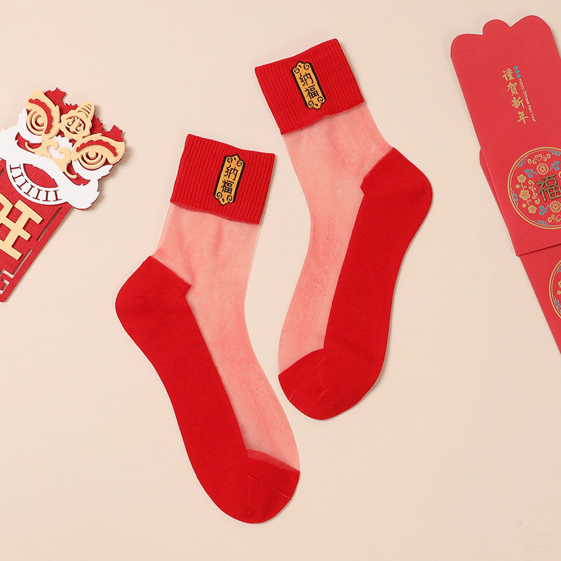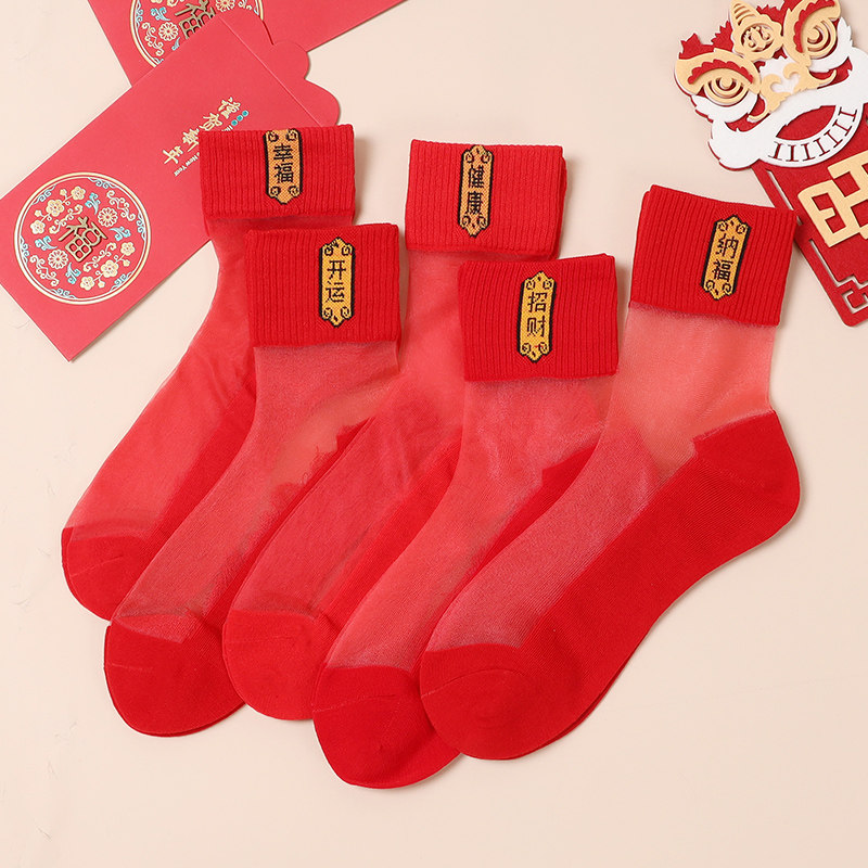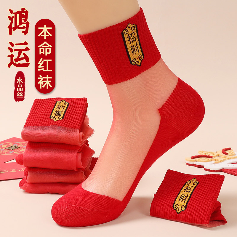 📚 本命年红色袜子女士水晶丝玻璃中筒袜底纯棉夏季薄款踩马年小人