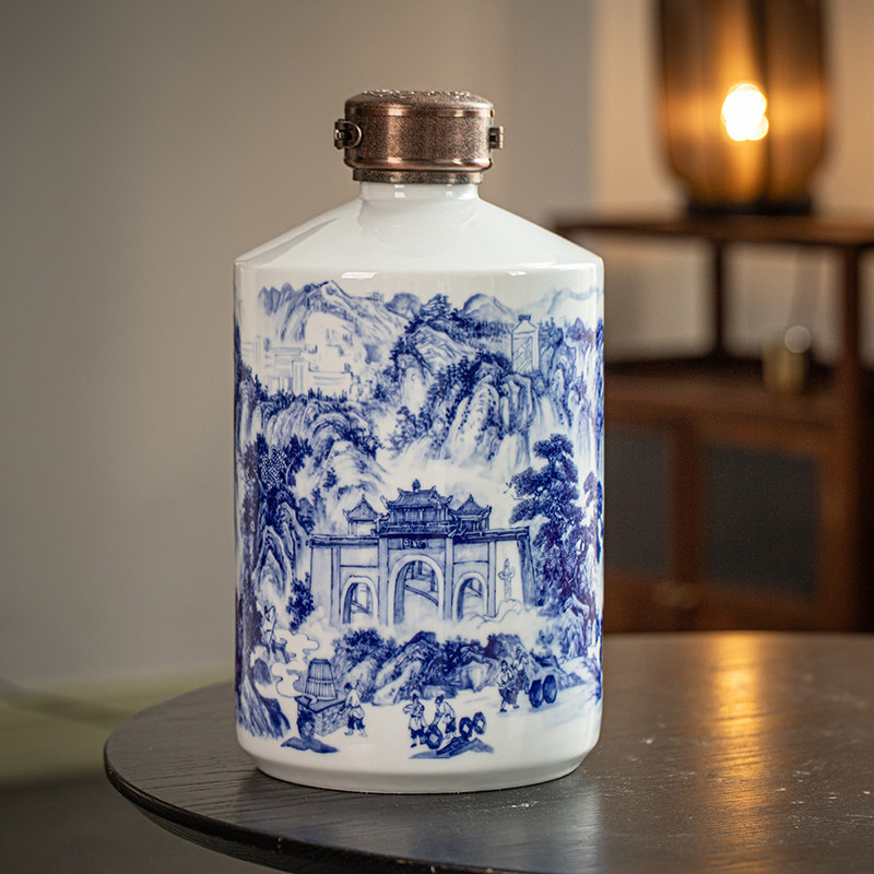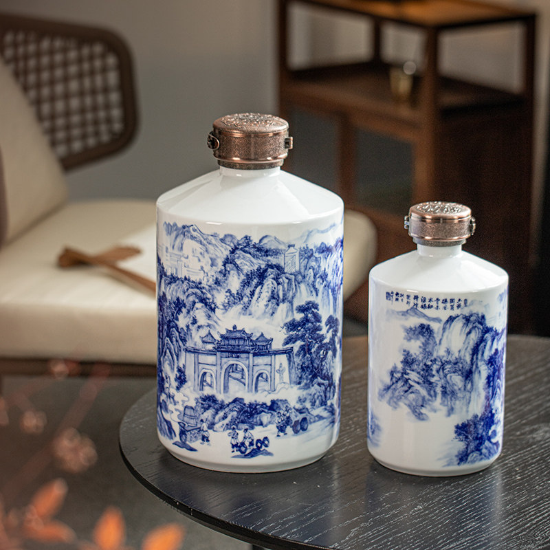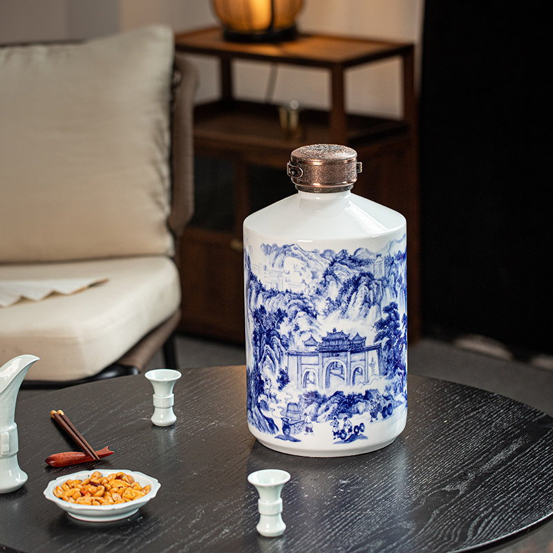 📚 景德镇陶瓷酒坛酒瓶青花山水茅型瓶家用酒罐5斤10斤创意密封定制