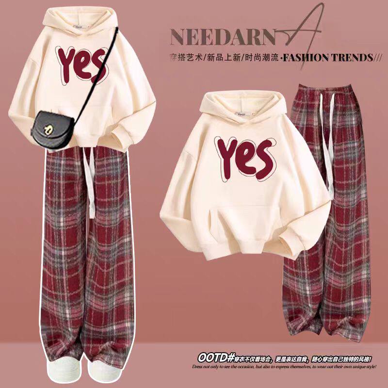 📚 女童红色连帽卫衣套装2025春秋新款中大童超好看格子裤加绒拜年服