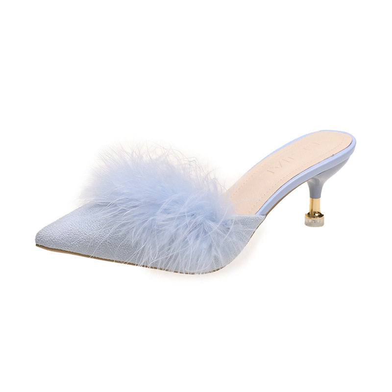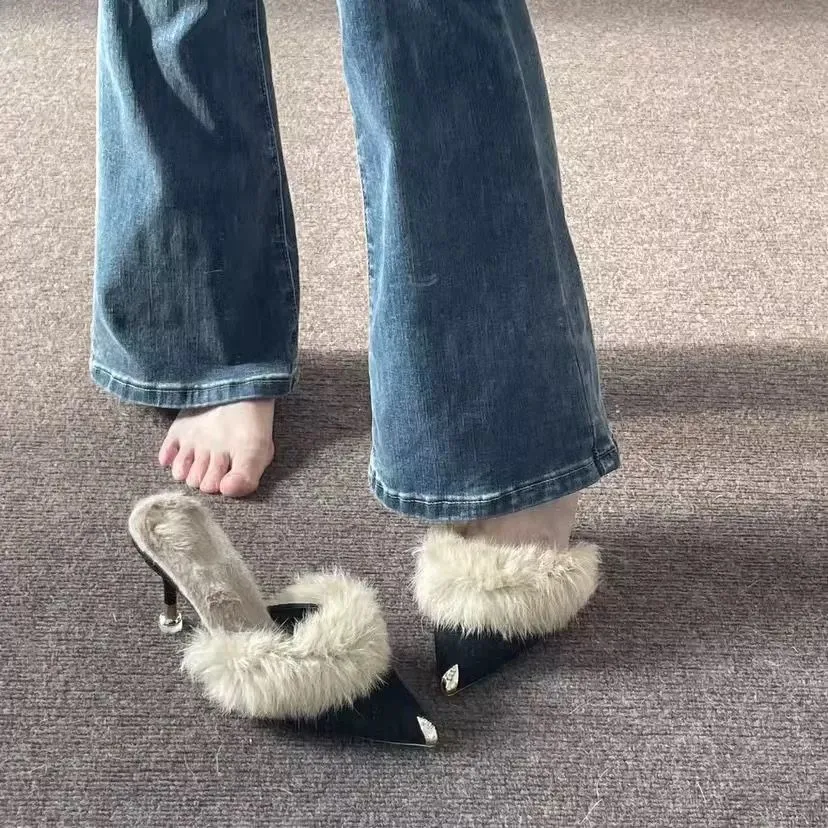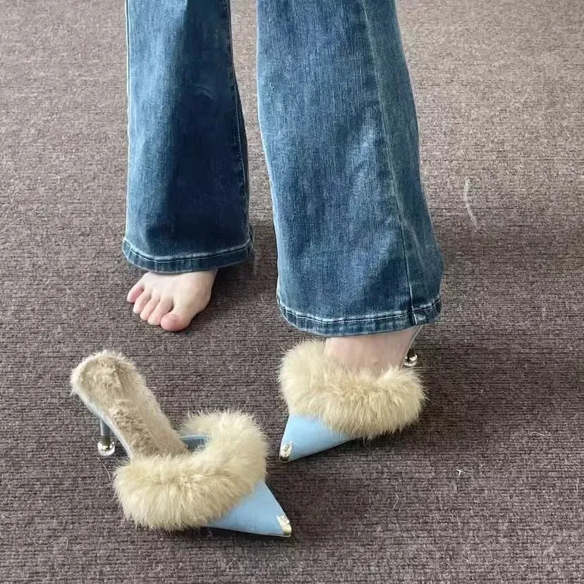 📚 毛毛高跟拖鞋女冬外穿加绒2025新款尖头半拖网红冬天拖鞋ins高跟