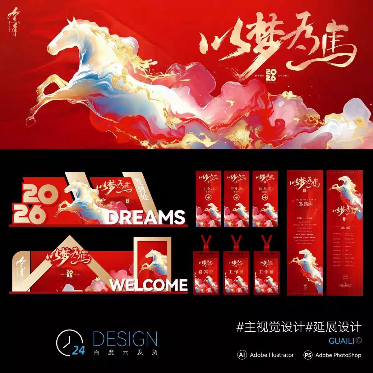 📚 X23高级红金国风马年新年元旦年会背景KV美陈dp点货架Ai设计素材