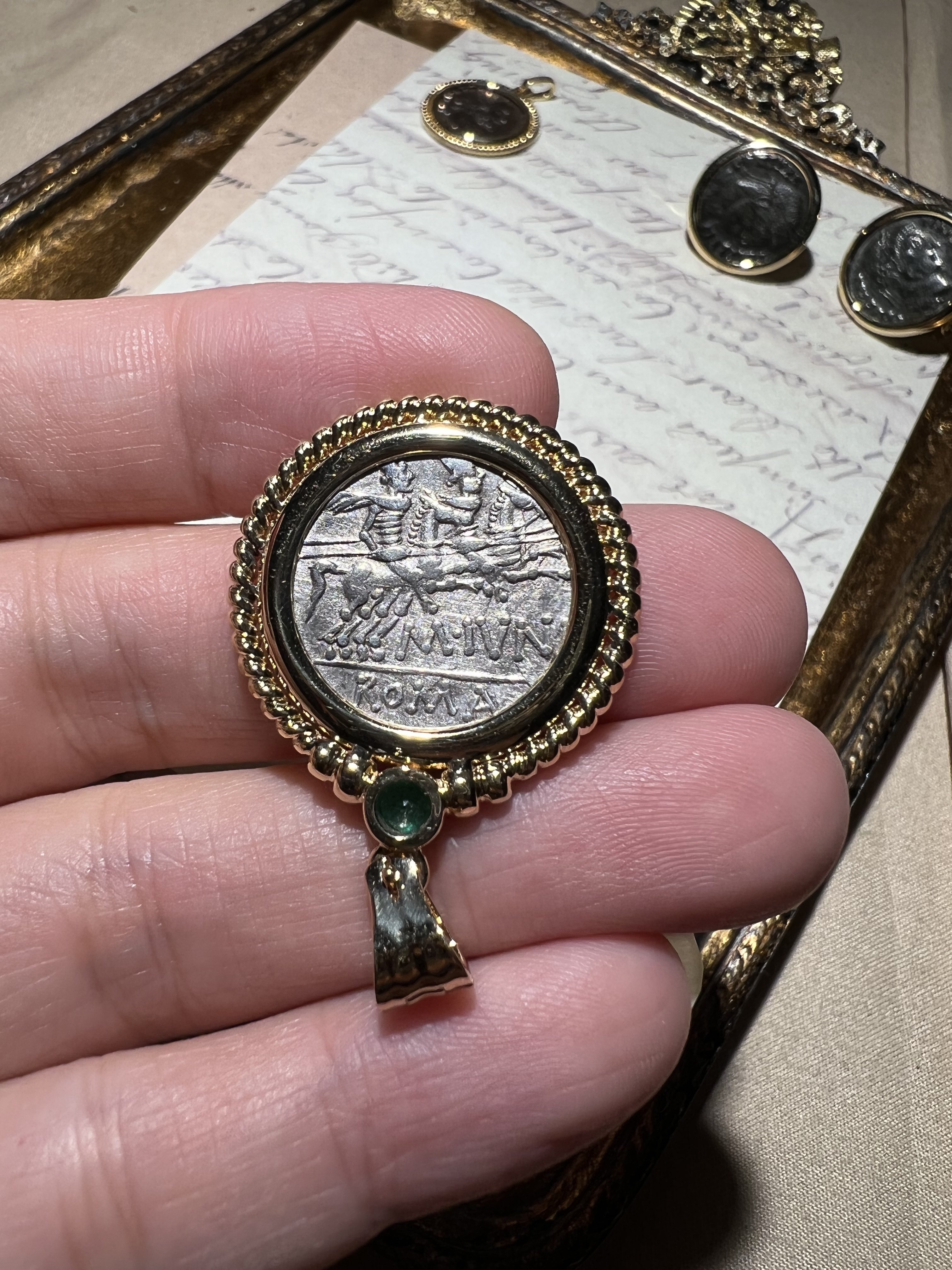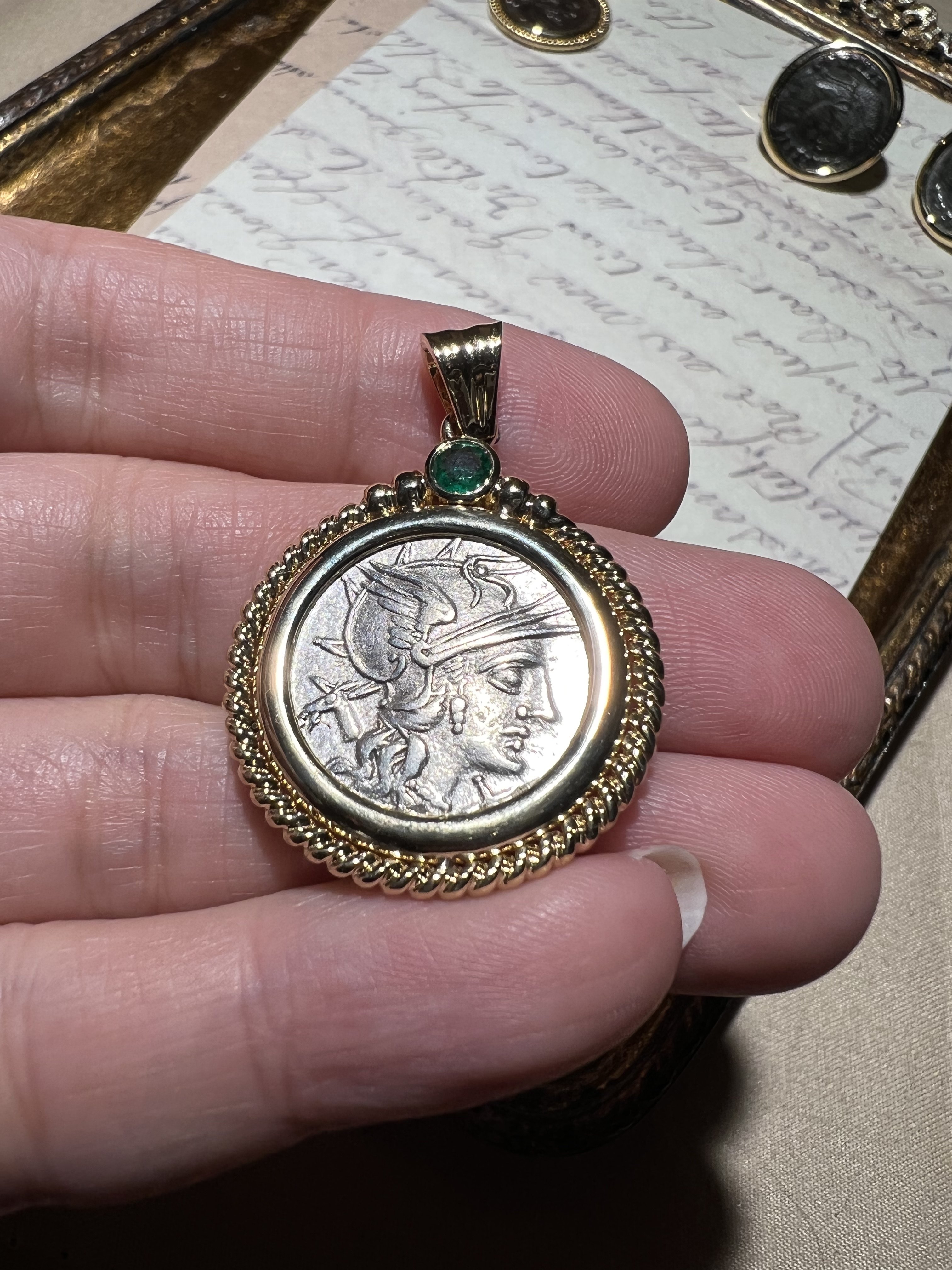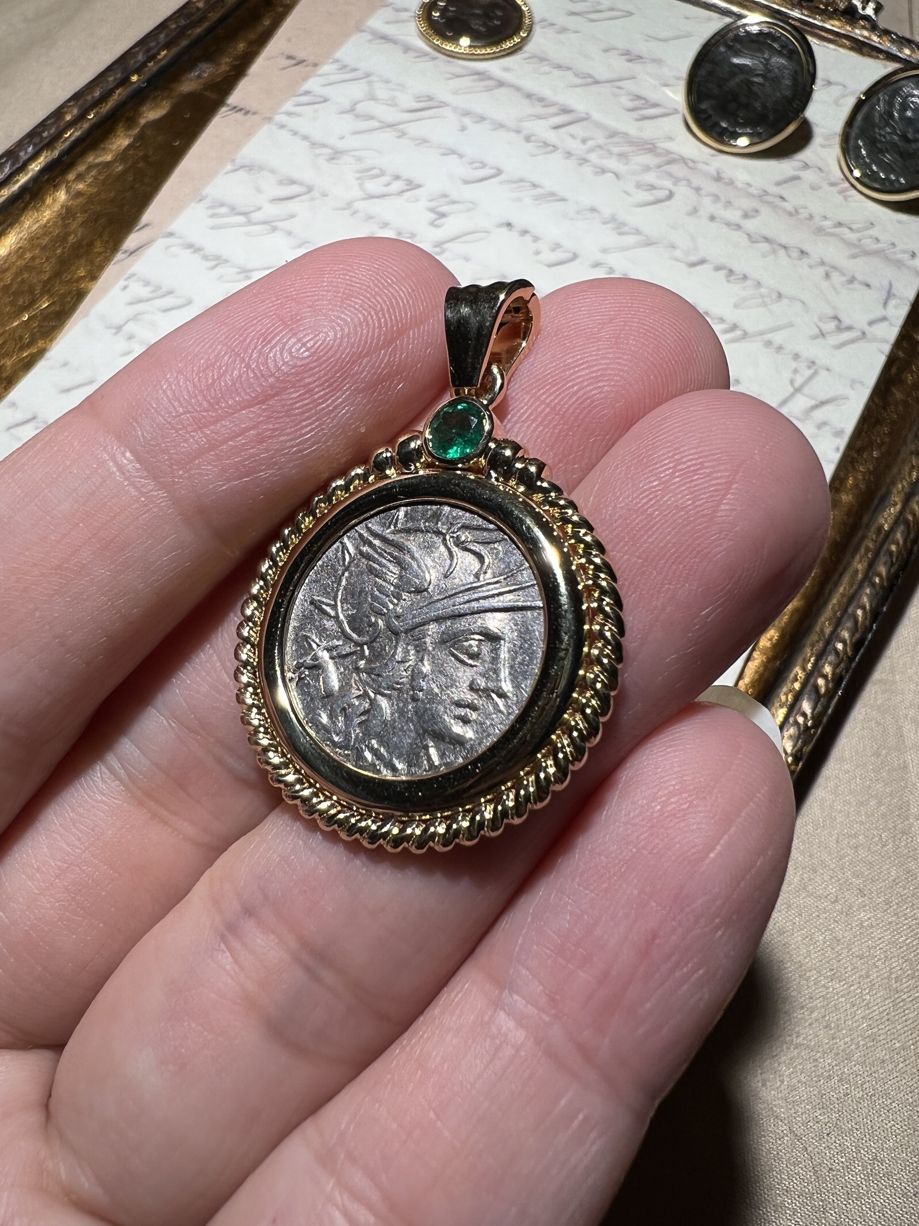 📚 客订欣赏 古罗马银币罗马女神银币吊坠18K金祖母绿古币吊坠