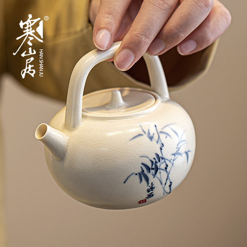 📚 寒山居苏打釉陶瓷泡茶壶手绘墨竹功夫茶具单壶侧把提梁壶绿岩茶壶