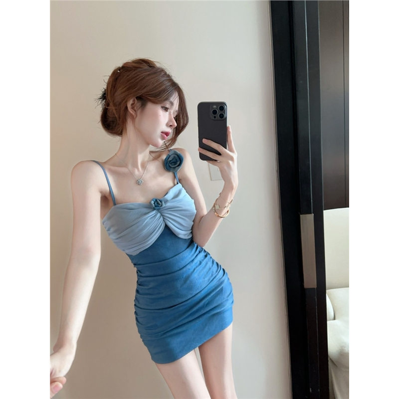📚 多巴胺网纱牛仔吊带连衣裙女夏季辣妹性感包臀裙绝美花朵抹胸裙子