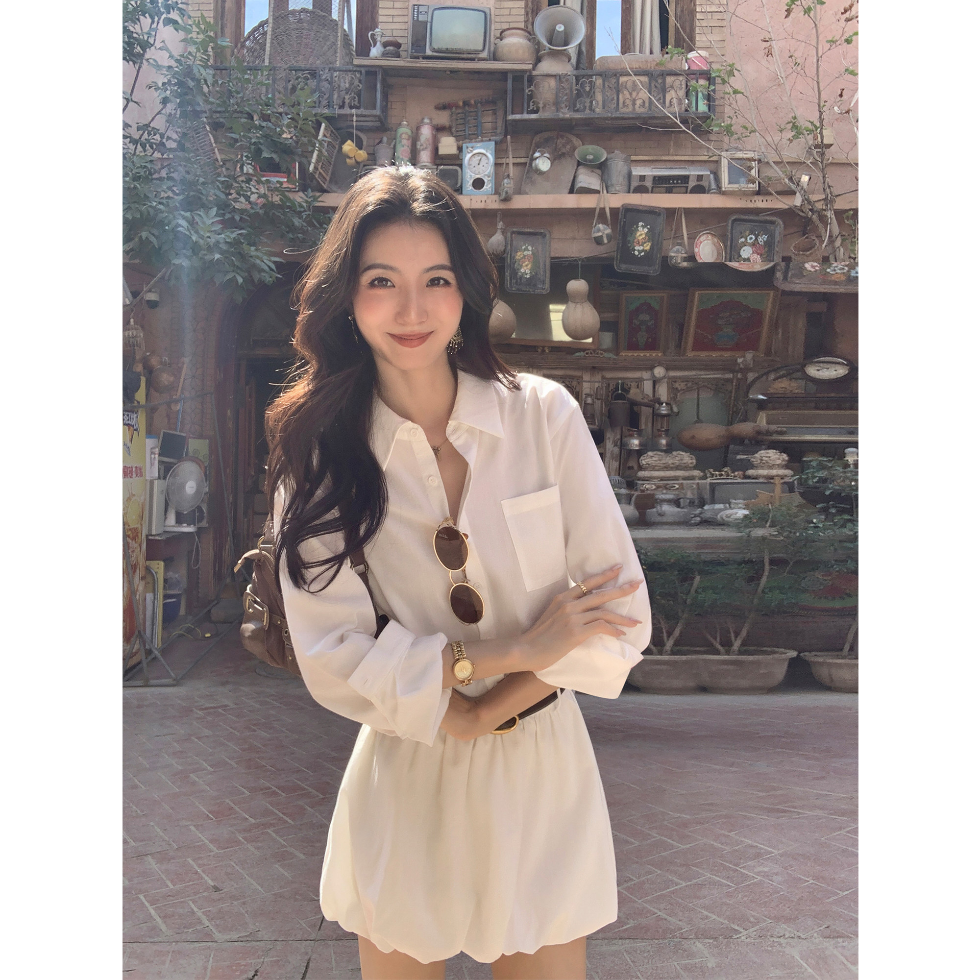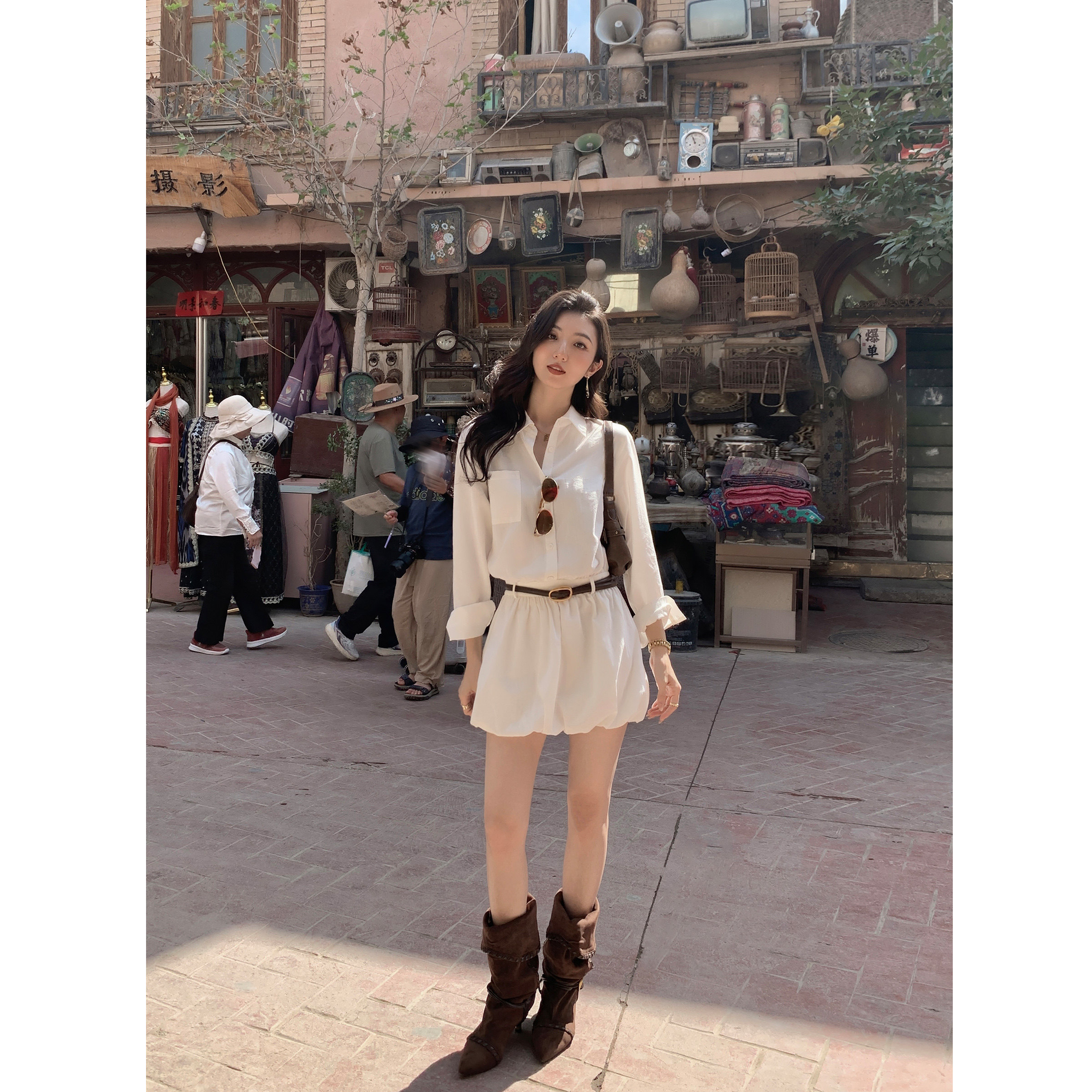 📚 MULVAN 山茶白茉莉 极简白色衬衫连衣裙女休闲收腰气质短款花苞裙