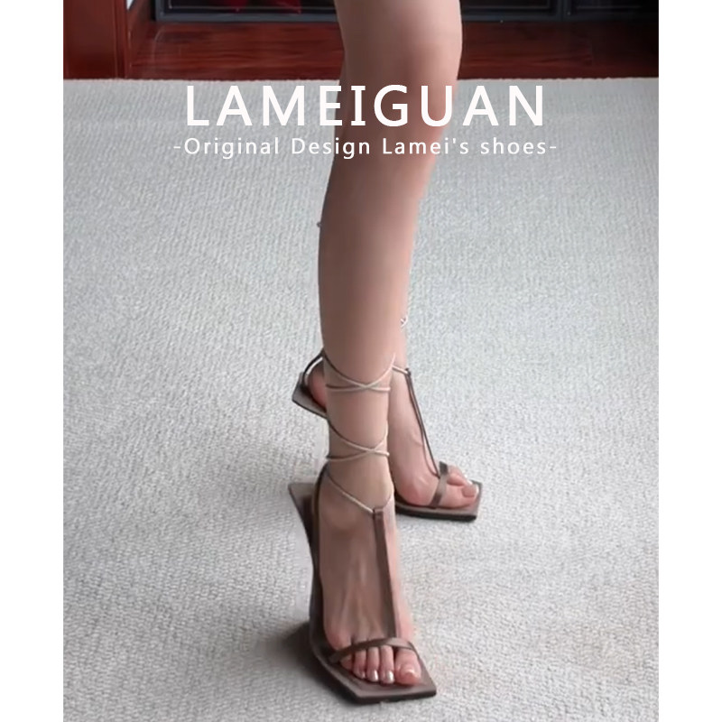 📚 性感绑带方头小个子坡跟凉鞋女夏2026新款棕色复古方头罗马高跟鞋