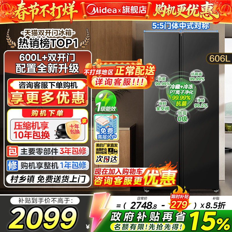 📚 【政府补贴】美的606对开双开门大容量一级节能风冷无霜家用冰箱