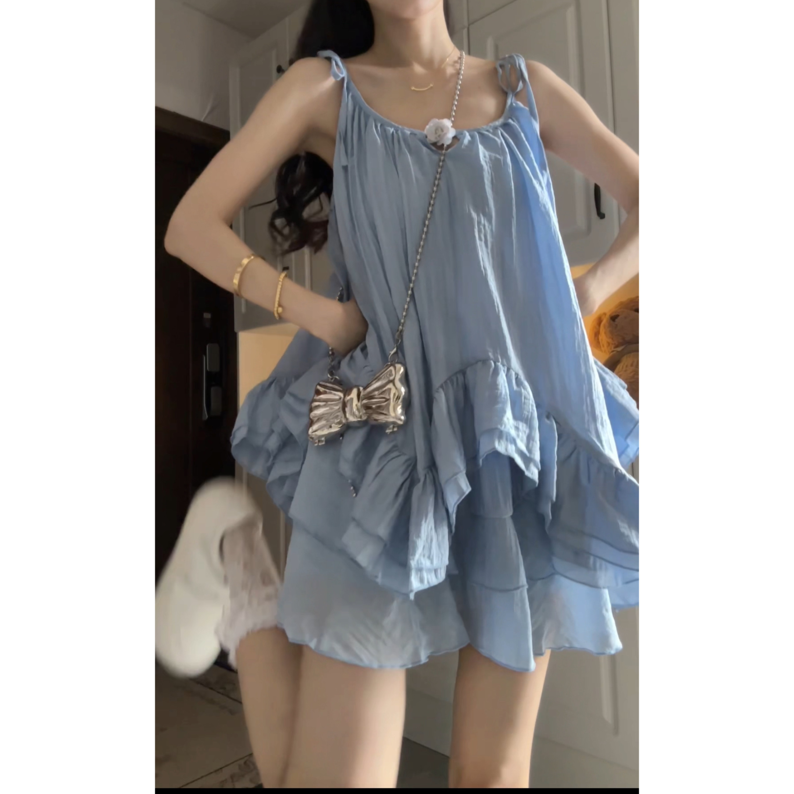 📚 Seven 七分糖 海盐小众立体花吊带背心蓝色套装女夏蓬蓬裙两件套