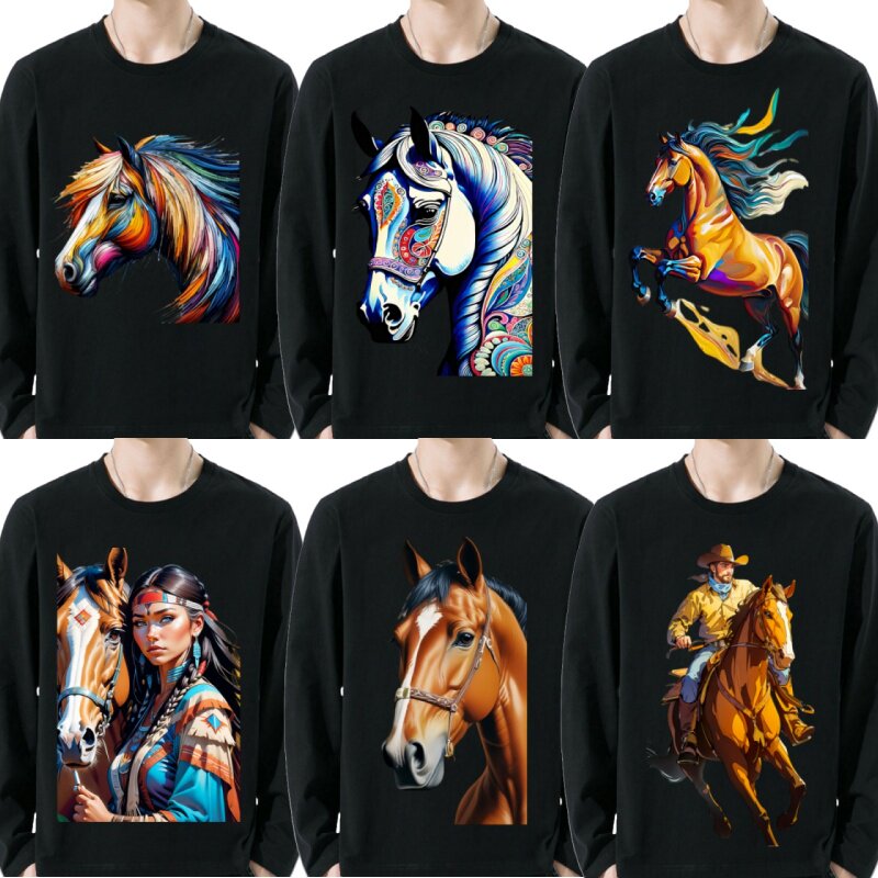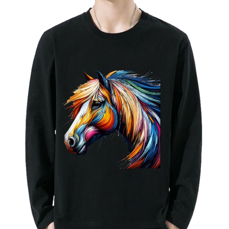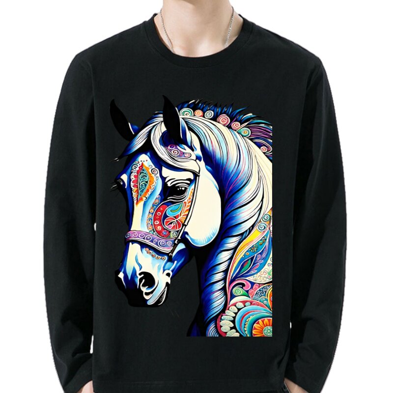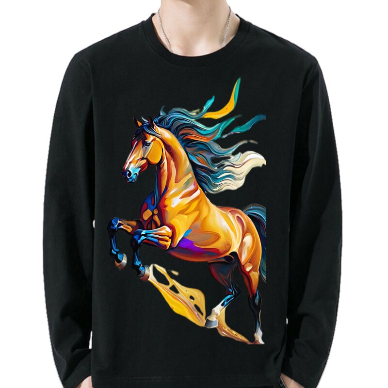 📚 秋装高清马图案马画潮牌宽松大码男士纯棉休闲个性长袖T恤打底衫
