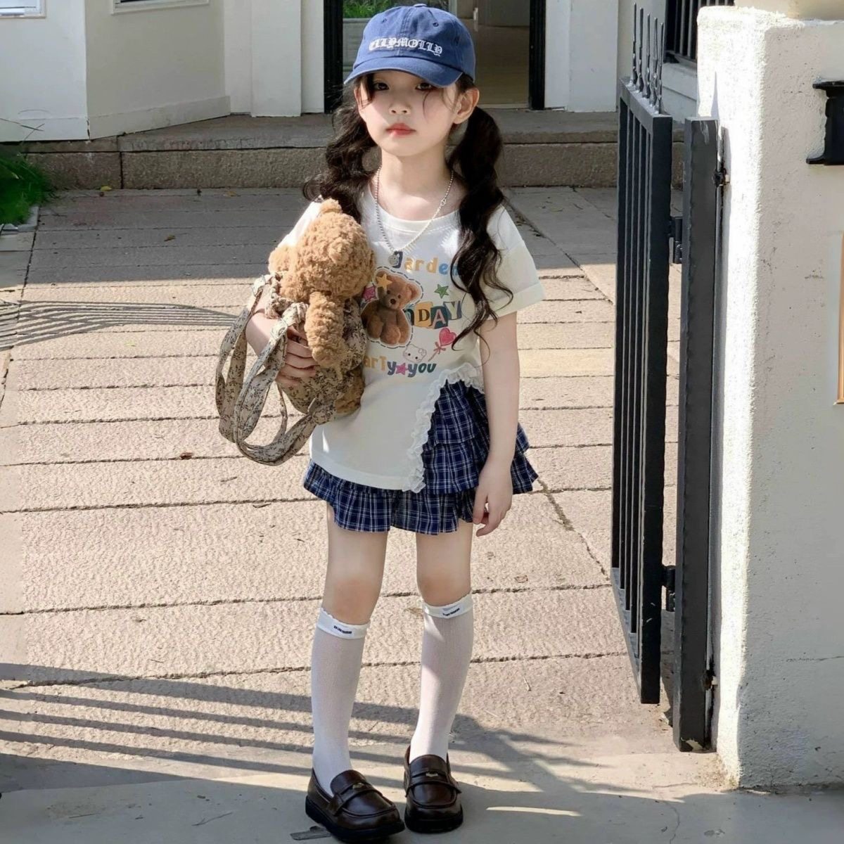 📚 女童夏装短袖T恤格子蛋糕裙套装新款宝宝洋气开叉上衣短裙两件套