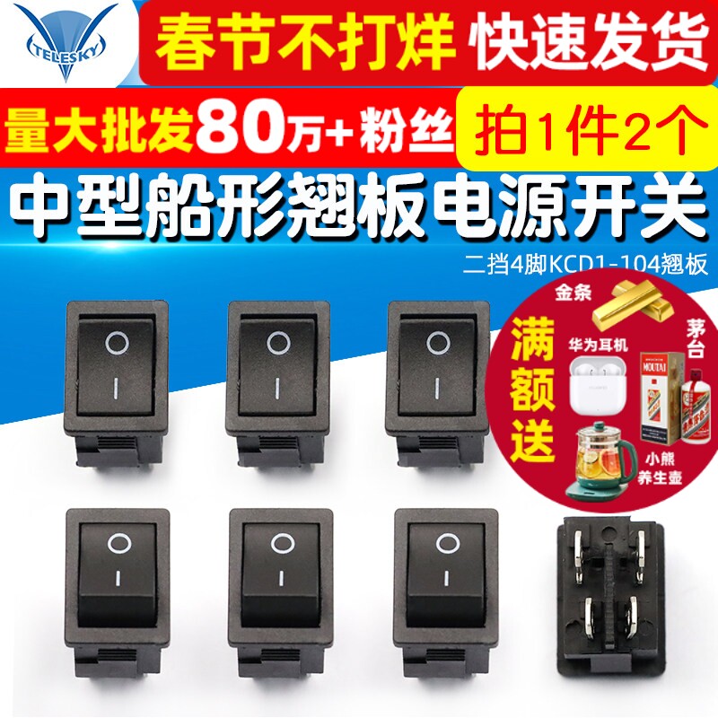 📚 船型开关 中型船形按钮二挡4脚KCD1-104翘板开关电源开关 (2个)