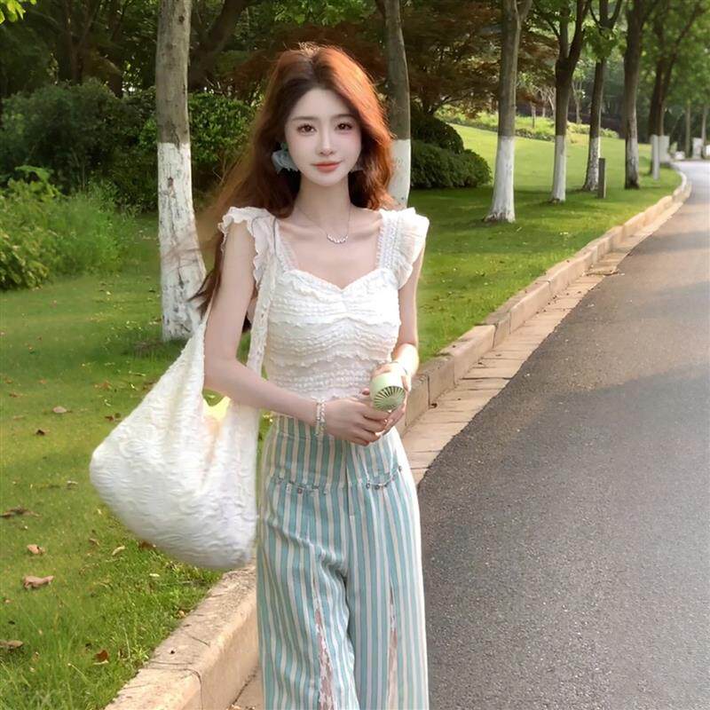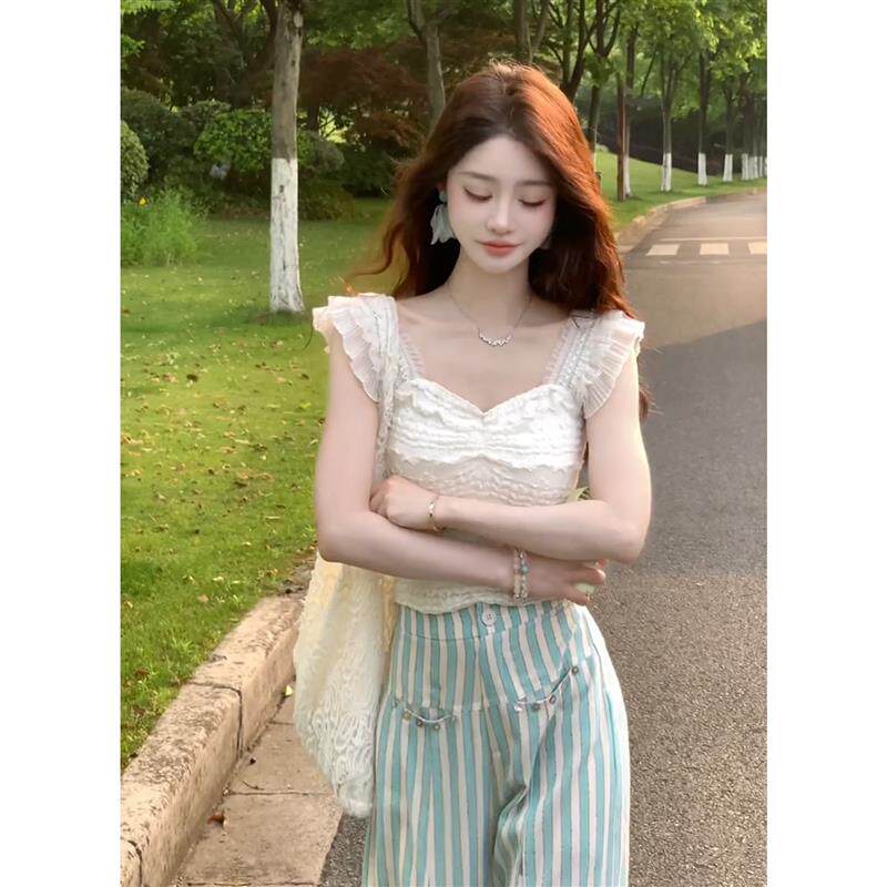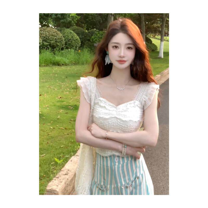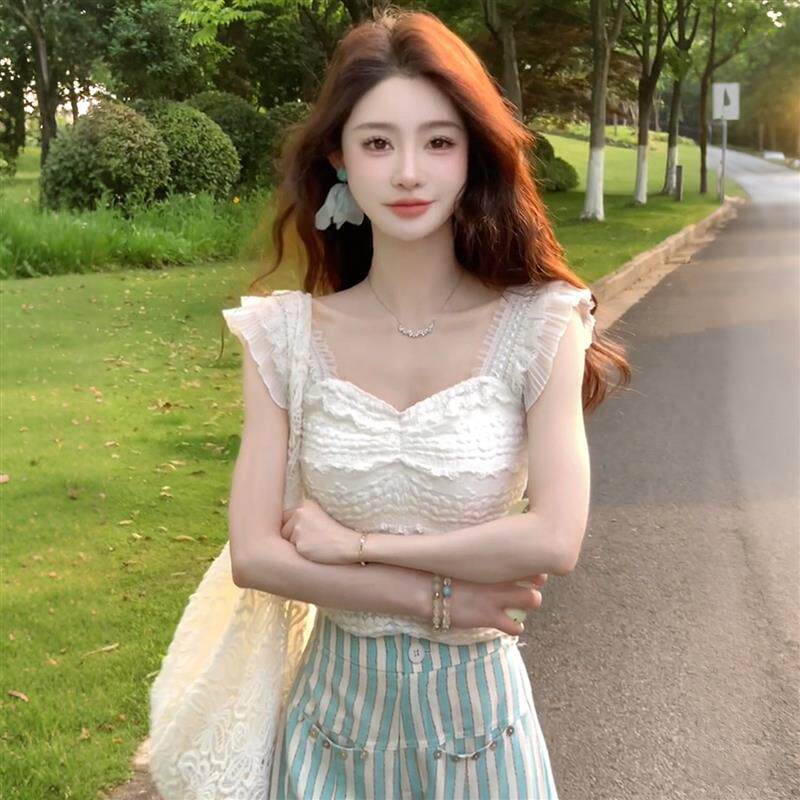📚 白色蕾丝花边方领小飞袖吊带背心女夏外穿修身显瘦辣妹穿搭短上衣