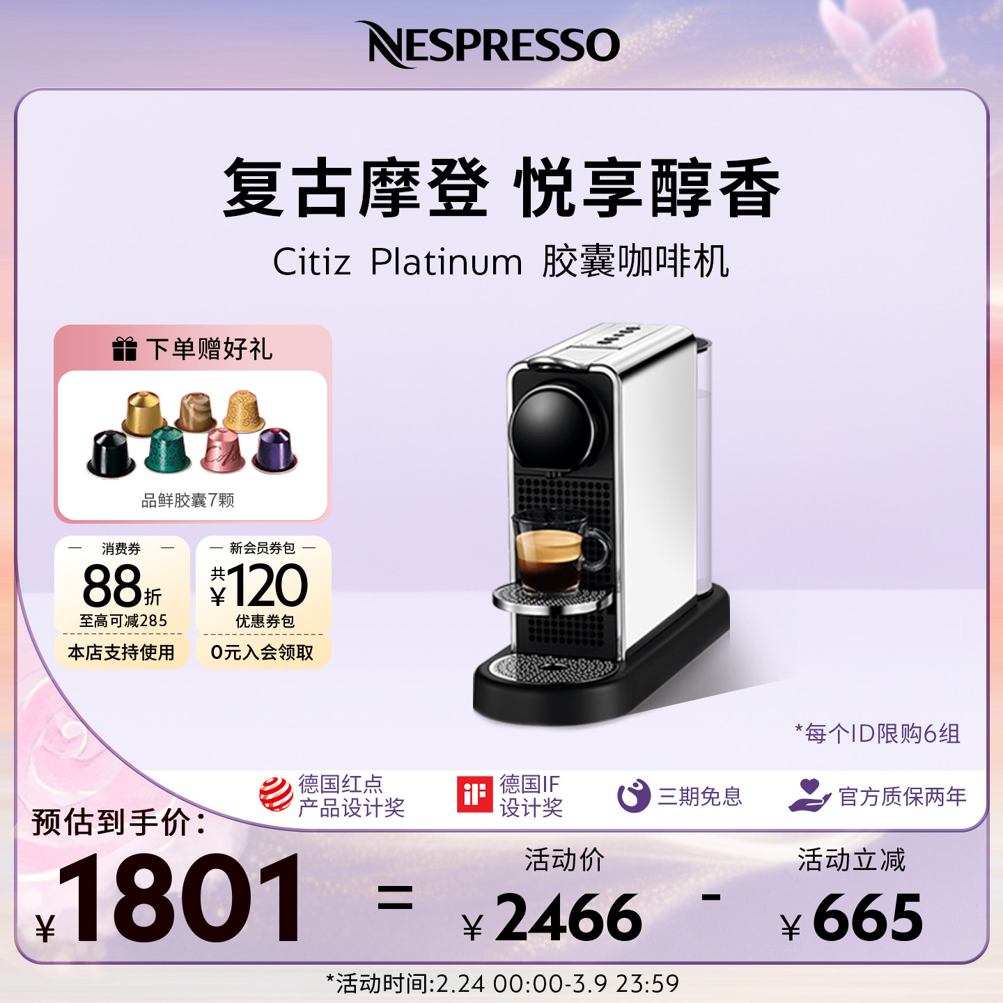 38¥ CZ057 bsBbUpAgrDK¥ https://m.tb.cn/h.iaQDc2z Nespresso奈斯派索全自动胶囊咖啡机家用意式小型Citiz Platinum --------------------- 【原售价】2,466元 【优惠券】317元 【券后价】2,149元。