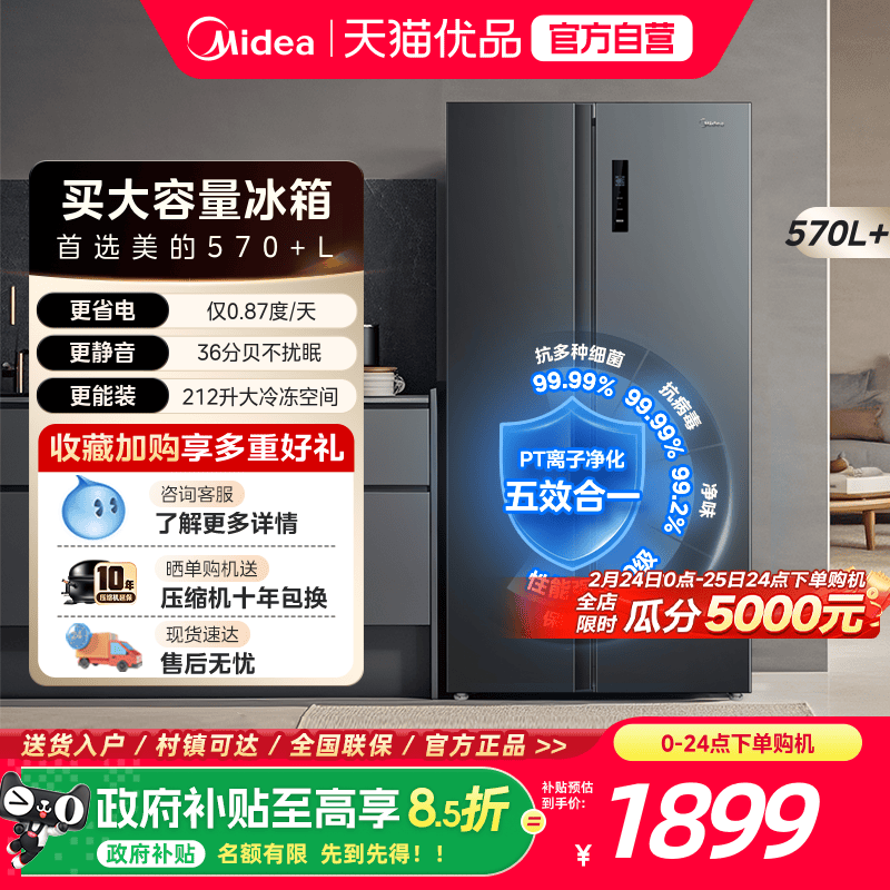 📚 美的570+对开双开门两门大容量家用冰箱一级节能风冷无霜超薄