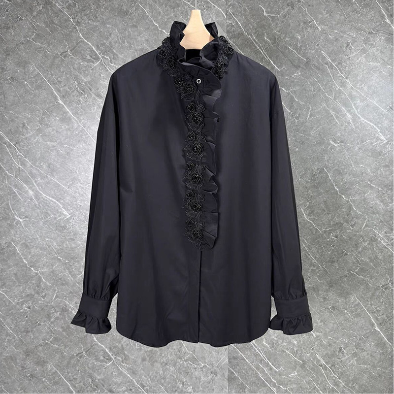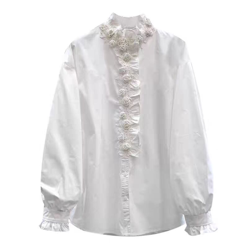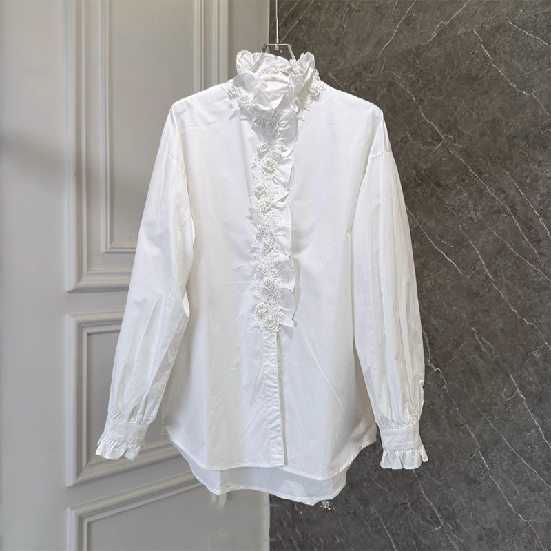 📚 立体钉珠花朵衬衫女重工2026春季新款法式荷叶边拼接长袖立领上衣
