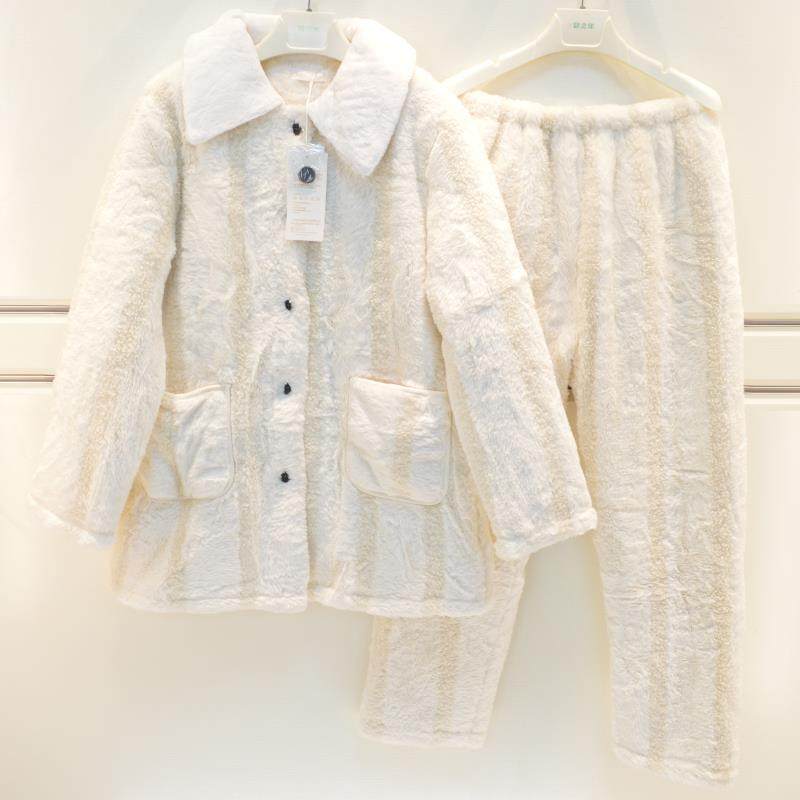 📚 雪尔绵睡衣2026冬季女士法兰绒三层加厚夹棉长款竖条宽松家居服套