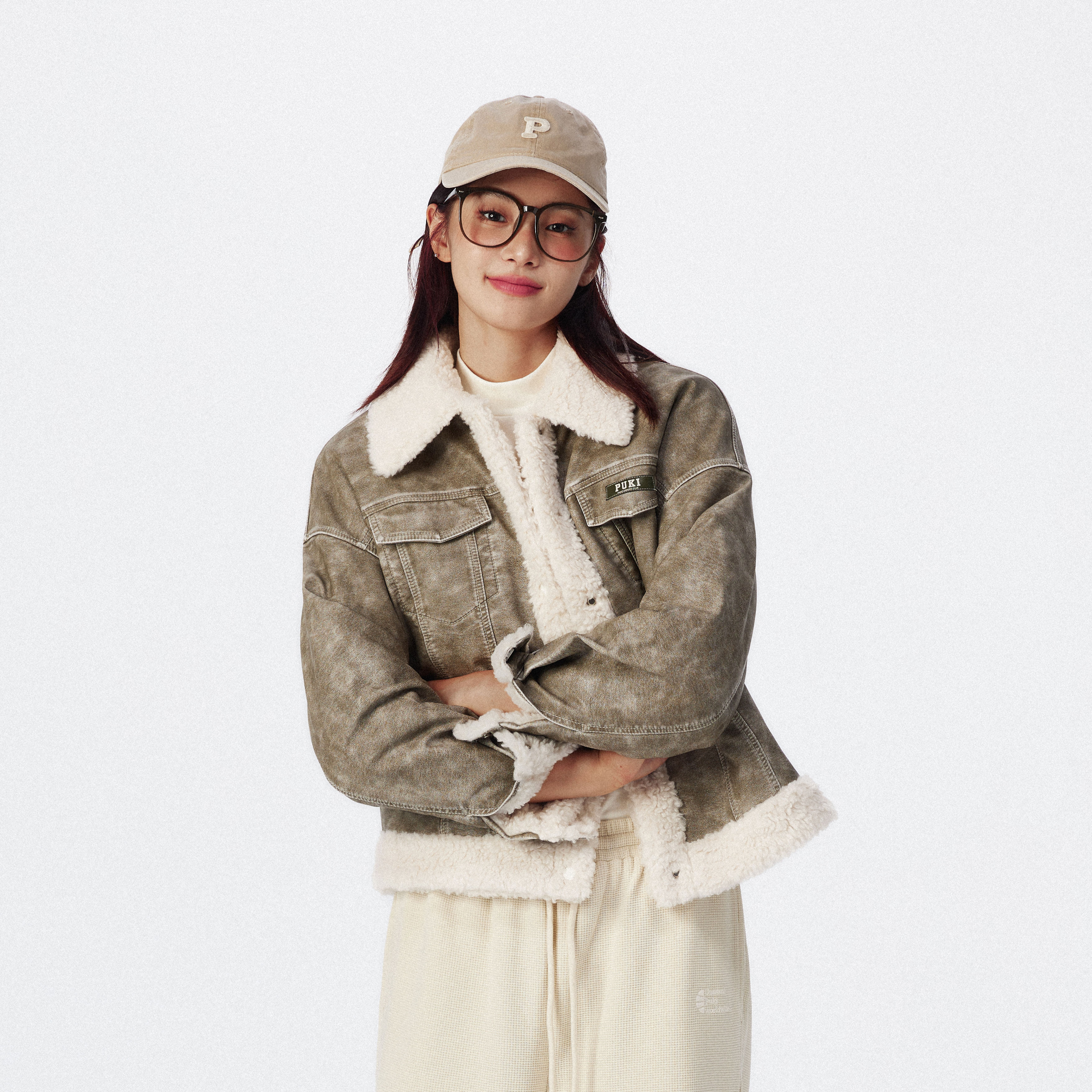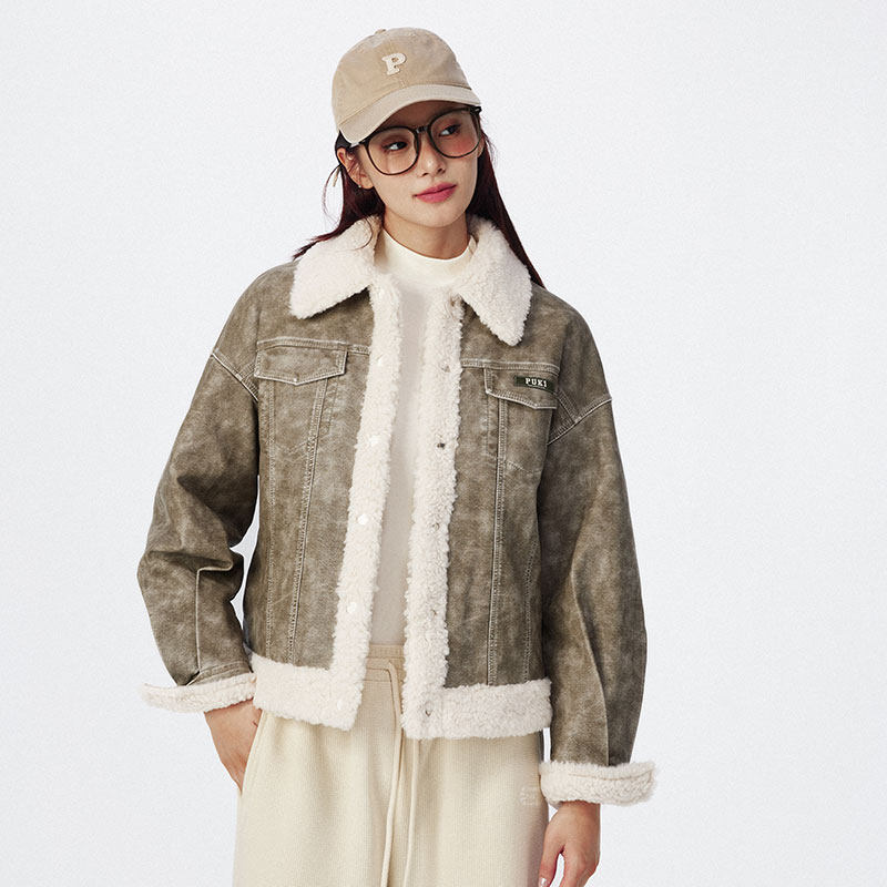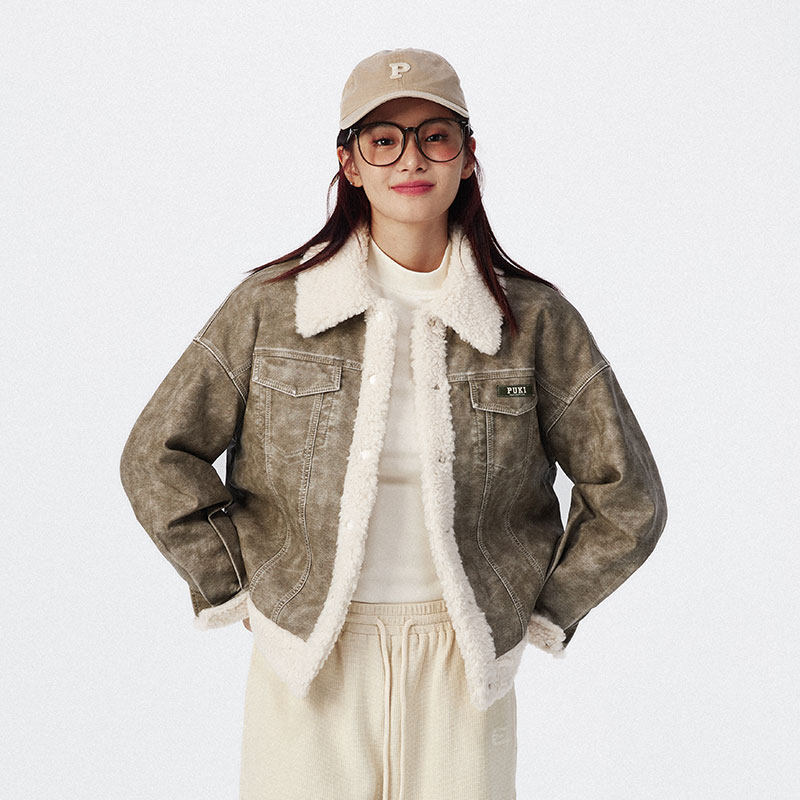 📚 PUKI 毛领皮夹克 重工水洗翻毛领短款辣妹复古短外套夹克