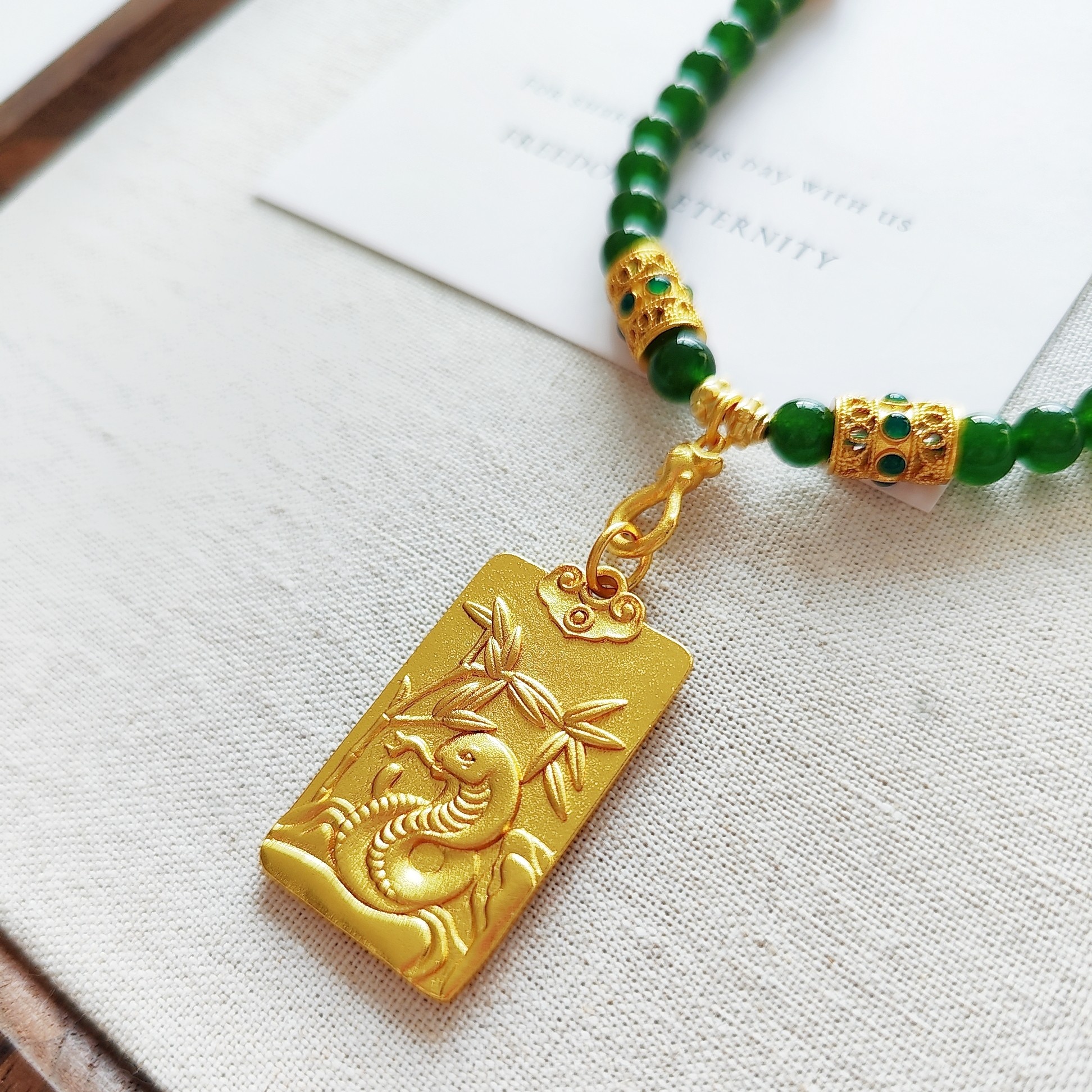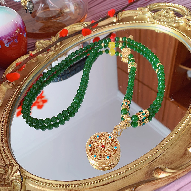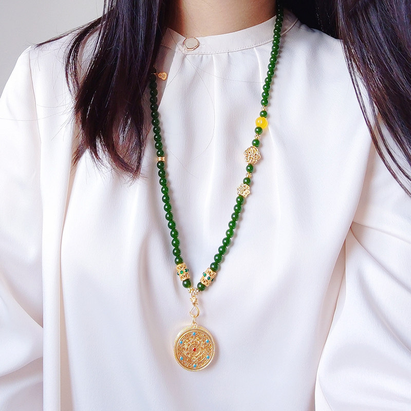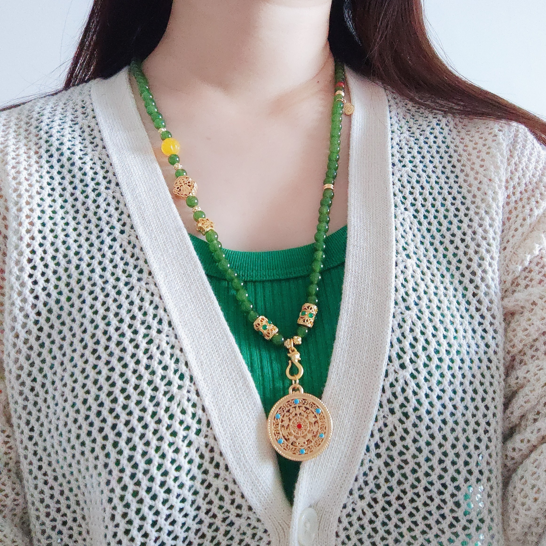 📚 新中式祖母绿绿玉髓八宝罗盘吊坠毛衣链女新款玛瑙玉石翡翠色项链